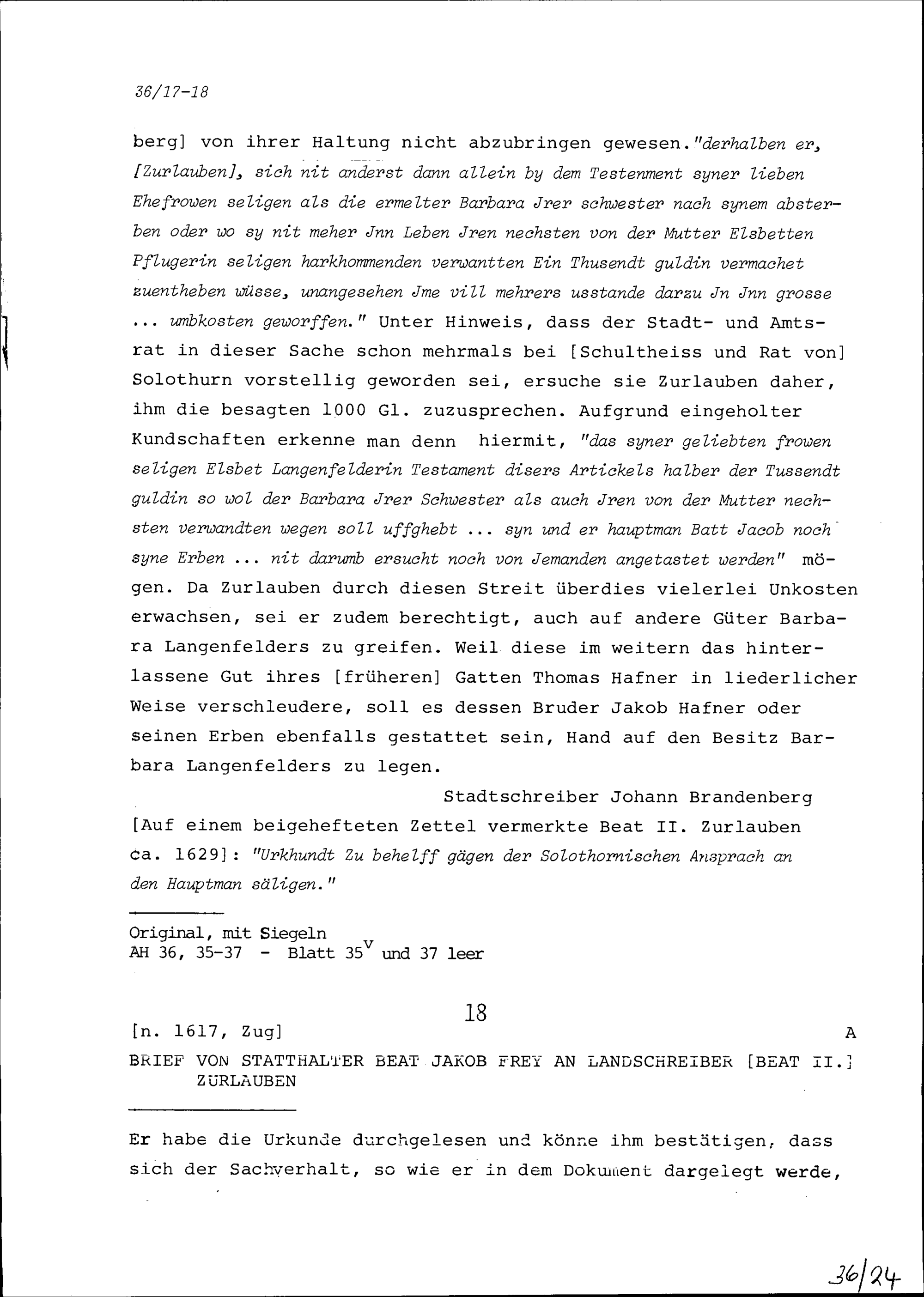 Beschluss des Stadt- und Amtrats Zug im Streit zwischen Beat Jakob Zurlauben, Hauptmann, und Barbara Langenfelder