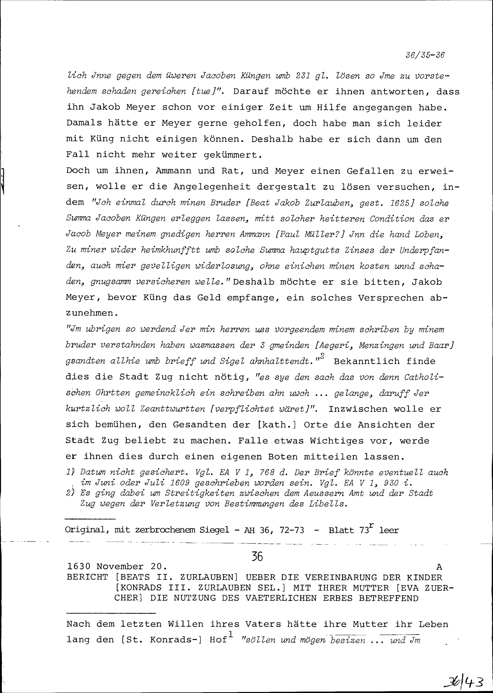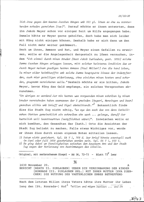 Schreiben von Konrad III. Zurlauben, Zuger Tagsatzungsgesandter und Stadtschreiber, an Ammann (Stabführer) und Rat der Stadt Zug