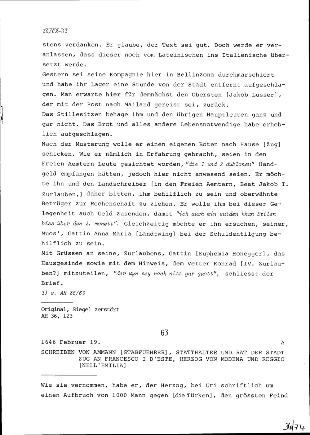 Schreiben von Johann Jakob Muos, Hauptmann, an Beat II. Zurlauben, Ammann und Hauptmann, Zug