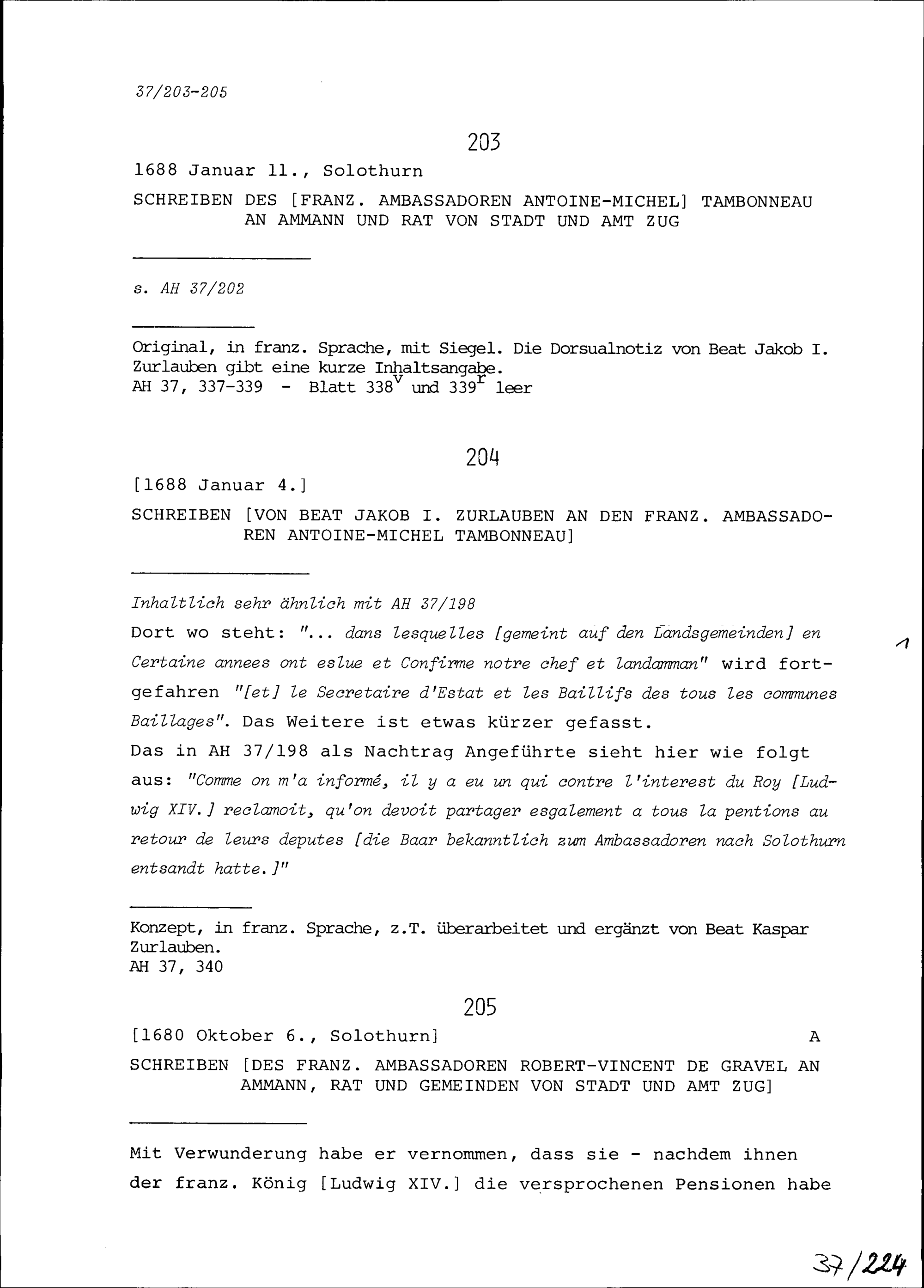 Schreiben von Robert-Vincent de Gravel, Ambassador von Frankreich, an Ammann, Rat und Gemeinden von Stadt und Amt Zug