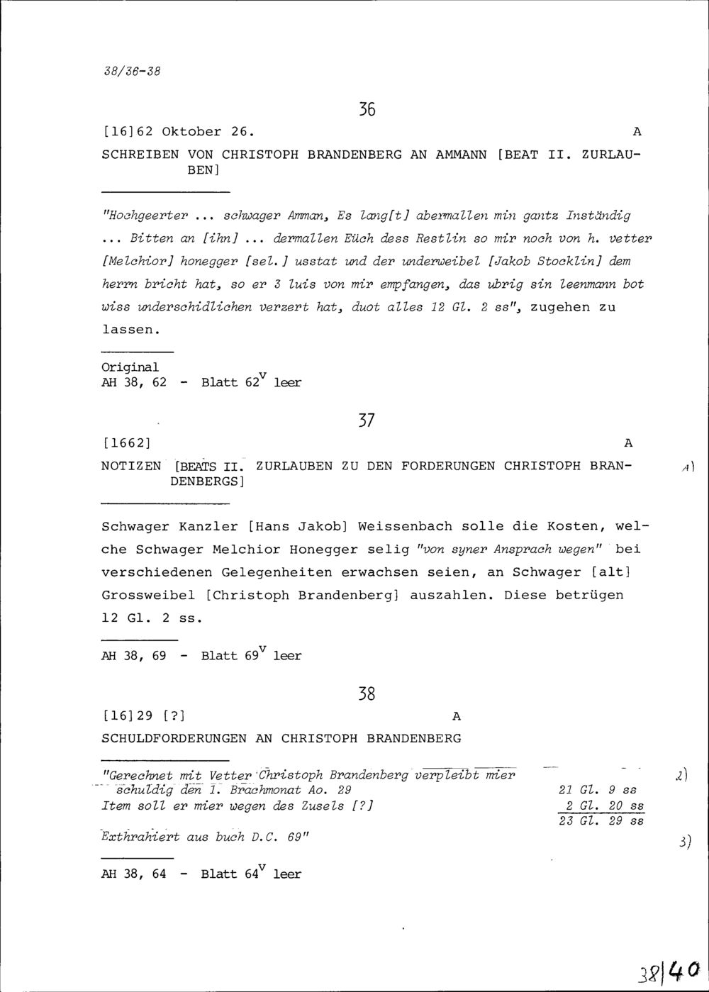 Notiz von Beat II. Zurlauben zu den Forderungen Christoph Brandenbergs