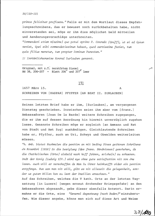 Schreiben von Wolfgang Hackenburger, Jesuitenpater, an Beat II. Zurlauben, Hauptmann...