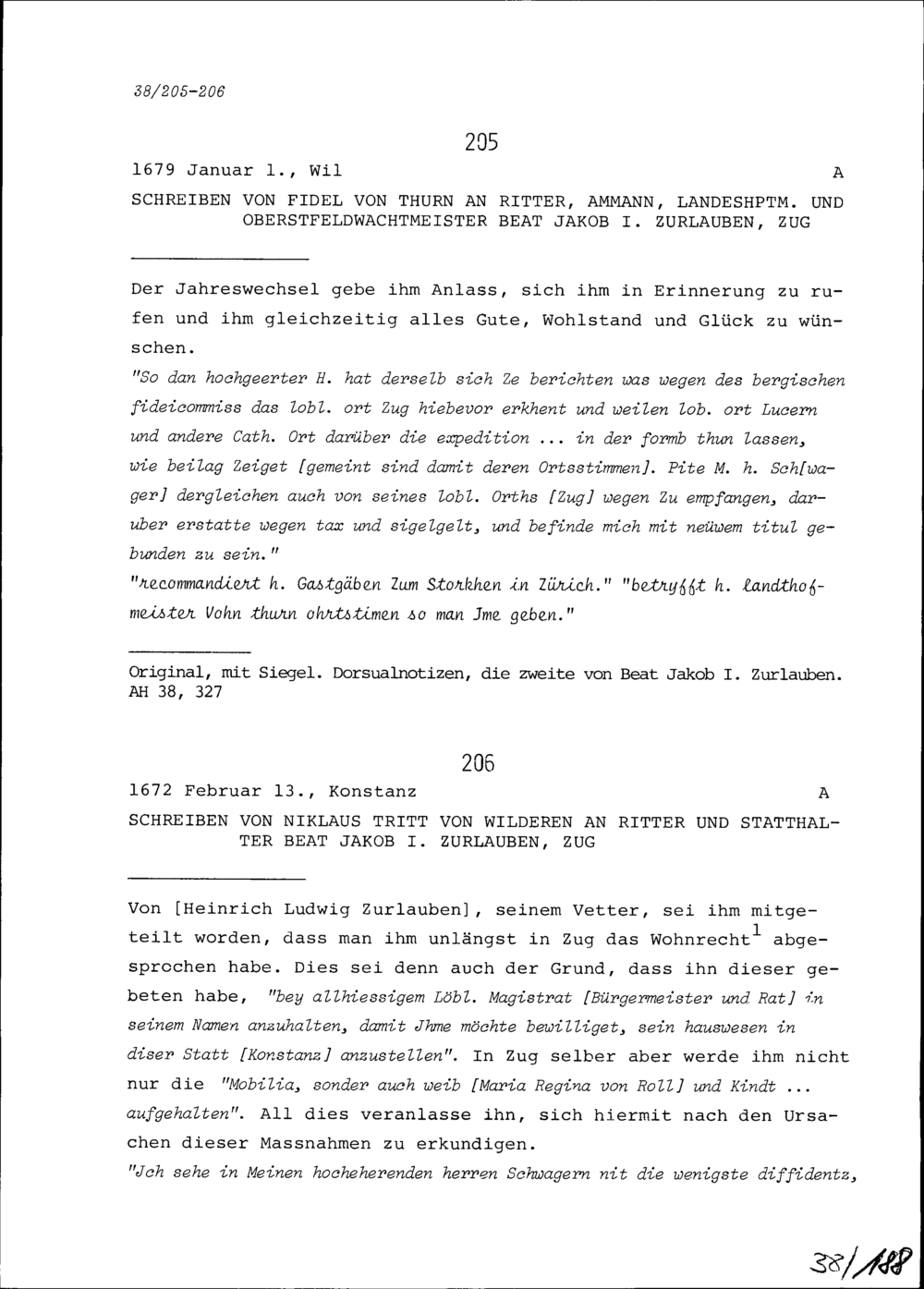 Schreiben von Niklaus Tritt von Wilderen an Beat Jakob I. Zurlauben, Statthalter, Zug