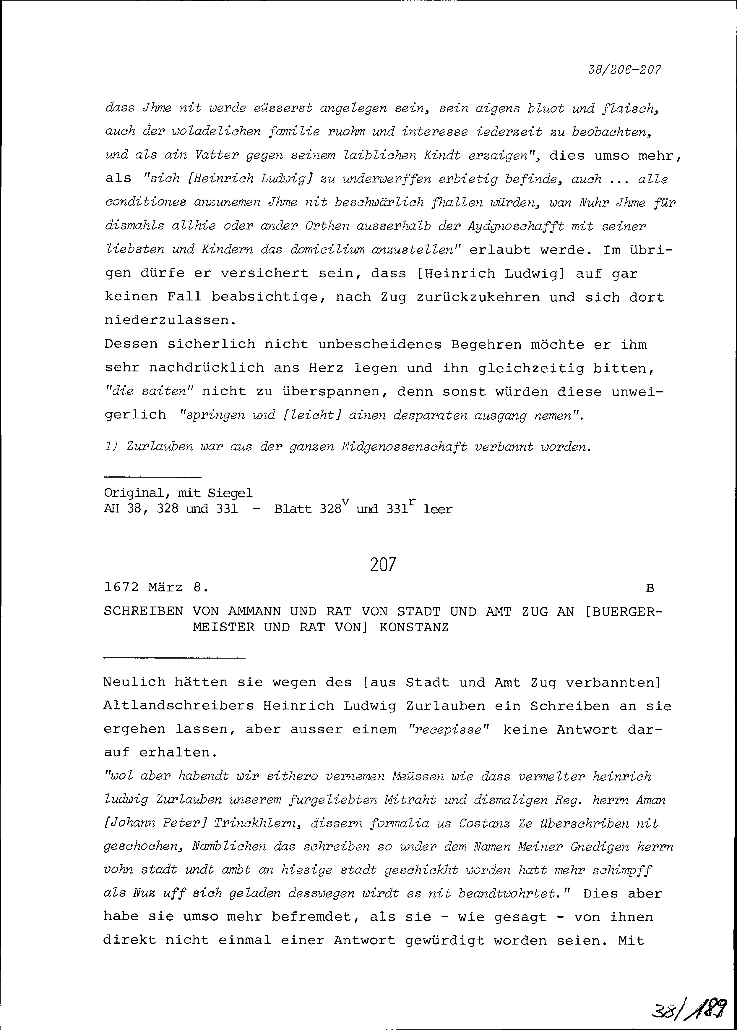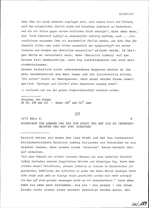 Schreiben von Niklaus Tritt von Wilderen an Beat Jakob I. Zurlauben, Statthalter, Zug