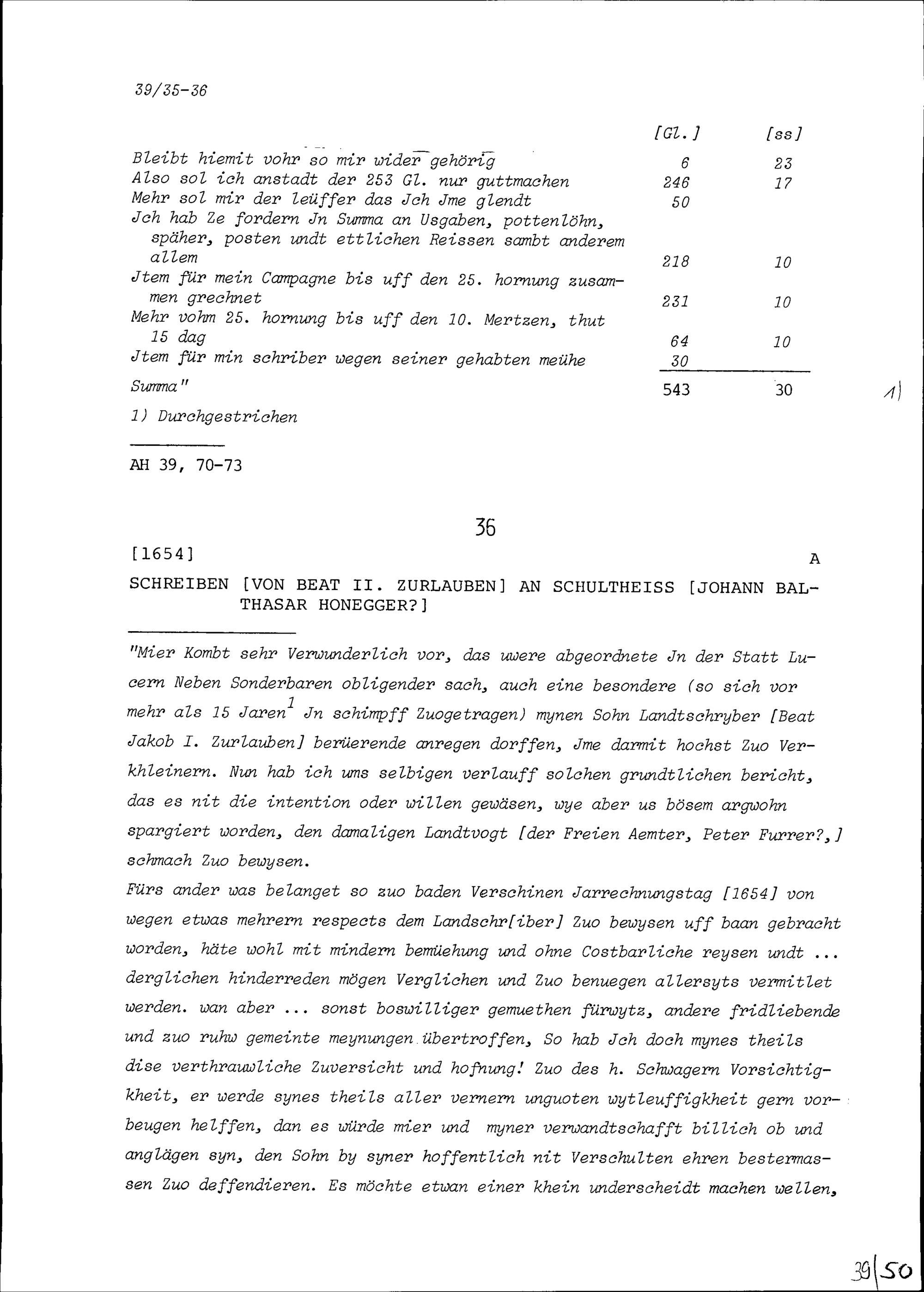 Ausgaben von Beat Jakob I. Zurlauben, Landschreiber, unter anderem in Zusammenhang mit dem Ersten Villmergerkrieg