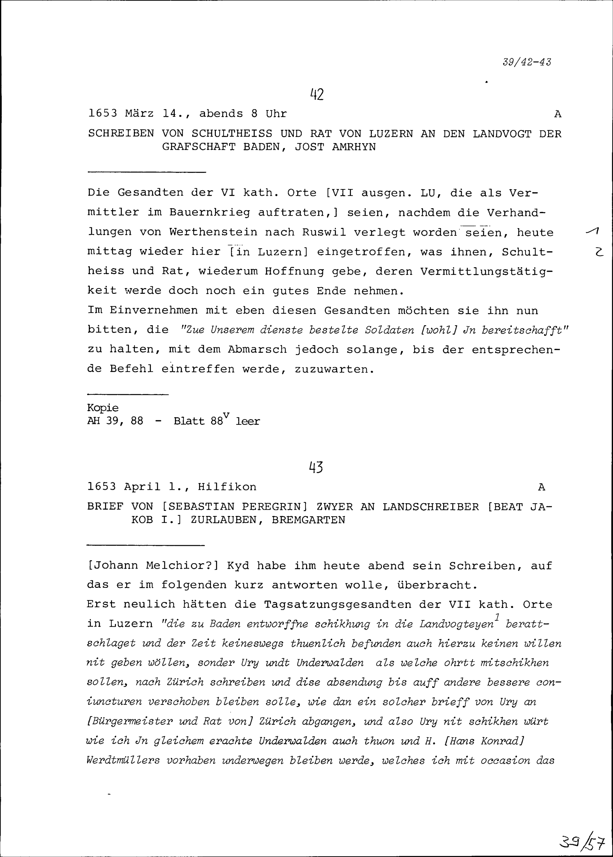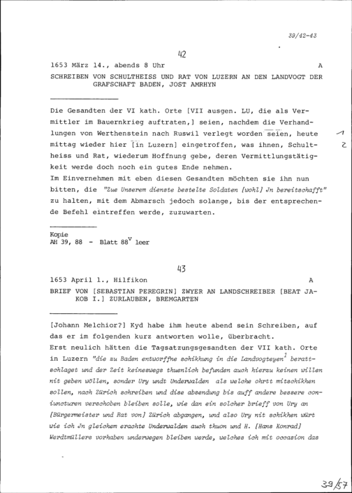 Schreiben von Sebastian Peregrin Zwyer an Beat Jakob I. Zurlauben, Landschreiber, Bremgarten