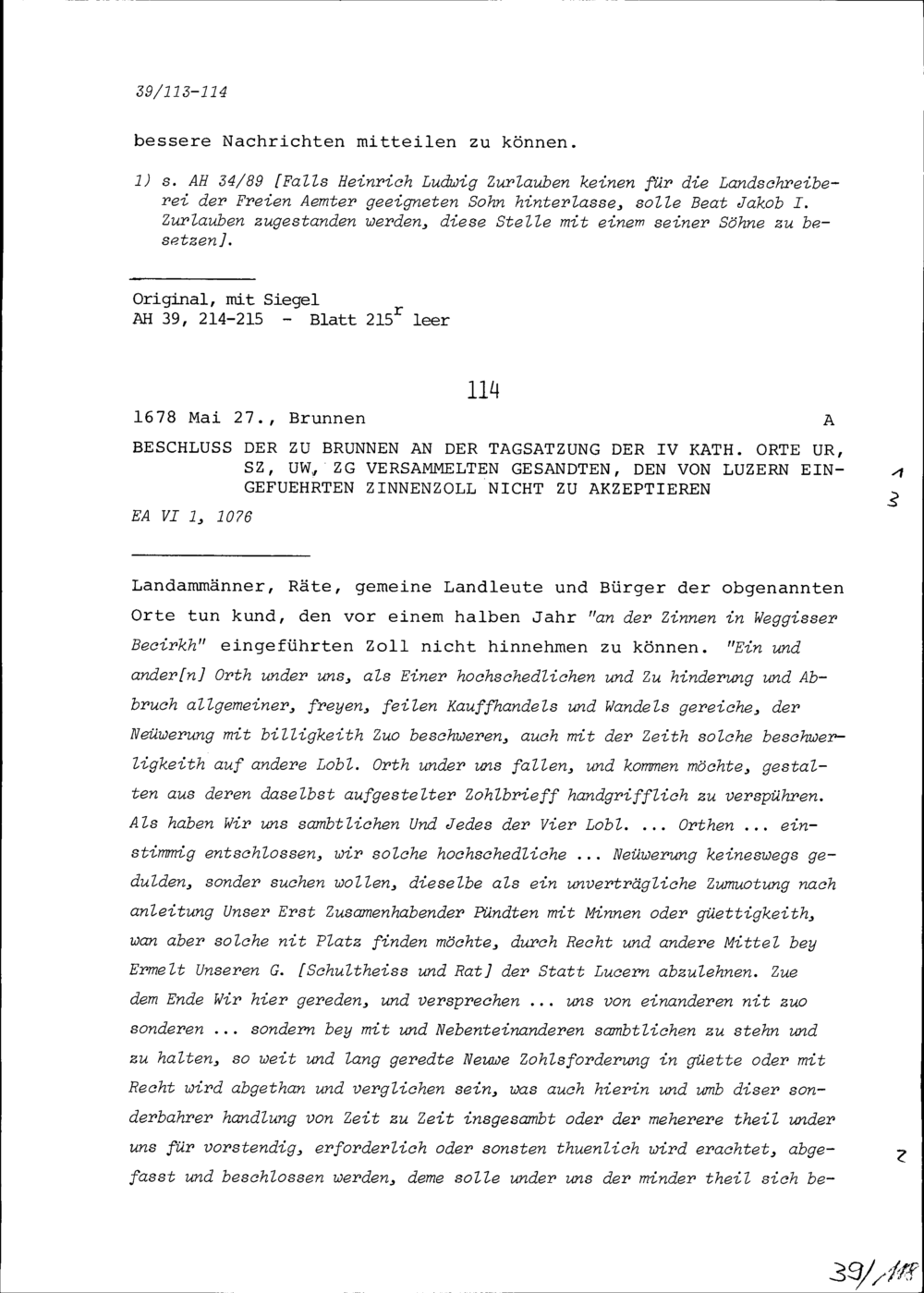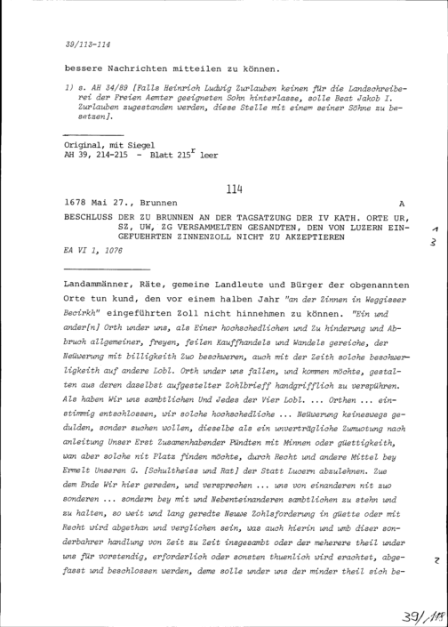 Schreiben von Johann Franz Betschart, Landammann, an Beat Jakob I. Zurlauben, Landeshauptmann und Statthalter, Zug