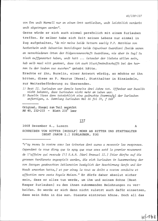 Schreiben von Gabriel Bucelin (eigentlich Gabriel Buzlin, pseudonym auch Gerhardus Belga), Prior zu Sankt Johann, an Beat II. Zurlauben, Ammann, Zug
