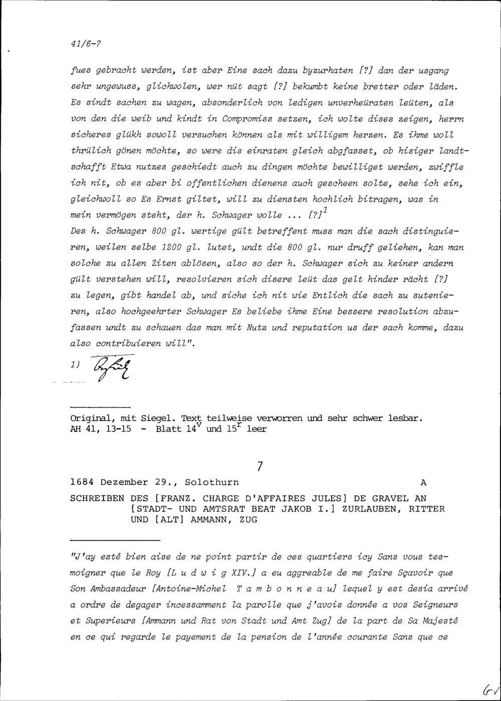 Schreiben von Johann Rudolf Dürler, Rat, an Beat Jakob I. Zurlauben, Ammann, Zug
