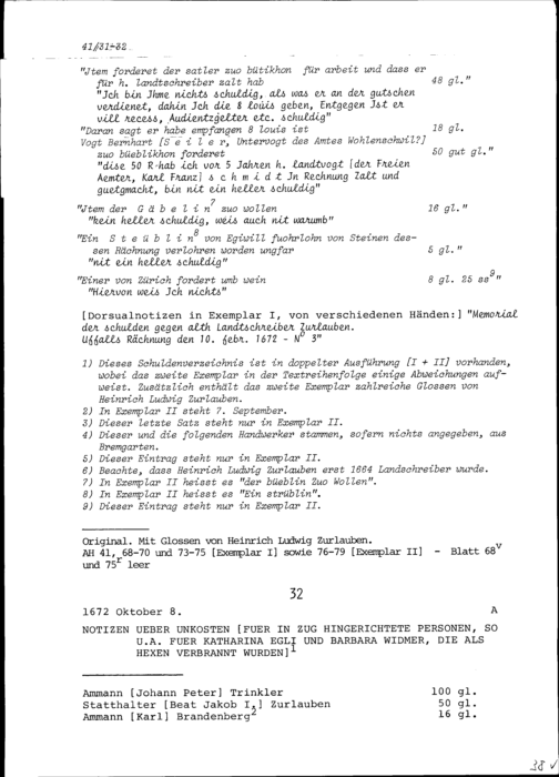 Schuldenverzeichnis von Heinrich Ludwig Zurlauben, Altlandschreiber der Freien Ämter, welches im Auftrage von Johann Melchior Kolin, Landschreiberstatthalter, aufgezeichnet und von Bremgarten nach Zug überschickt wurde