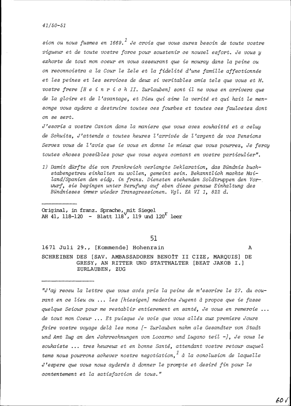 Schreiben von François Mouslier, Resident von Frankreich, an Beat Jakob I. Zurlauben, Statthalter, Zug
