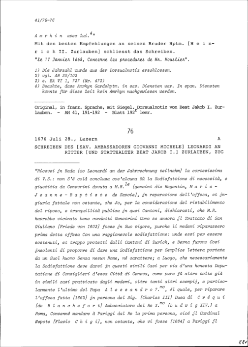 Schreiben von Alfons von Sonnenberg, Schultheiss, an Beat Jakob I. Zurlauben, Stadt-...