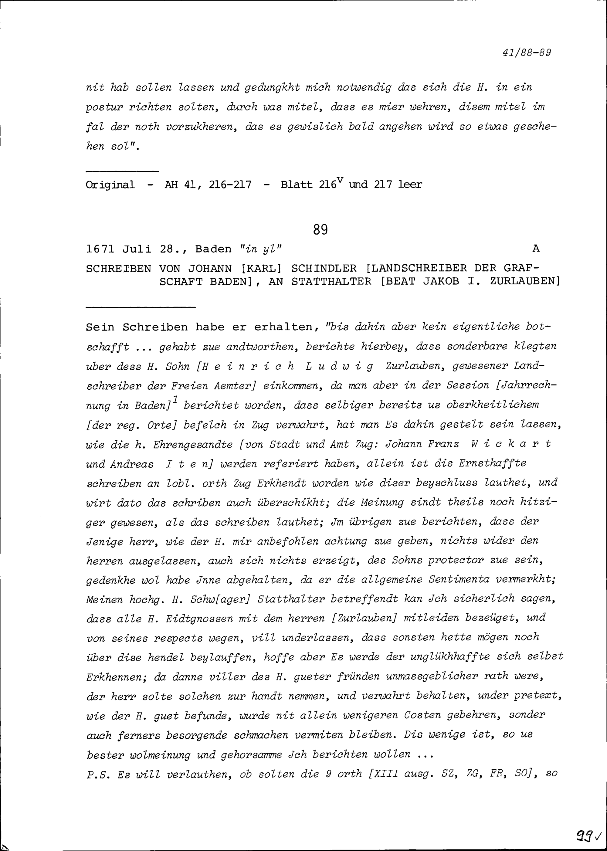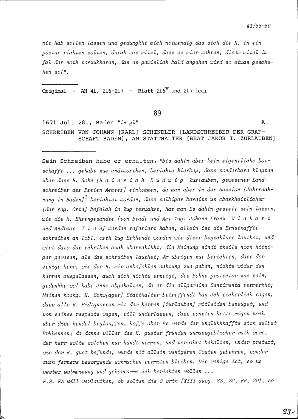 Schreiben von Franz Heinrich Pfyffer, Kommandant von Mellingen, an Beat Jakob I....