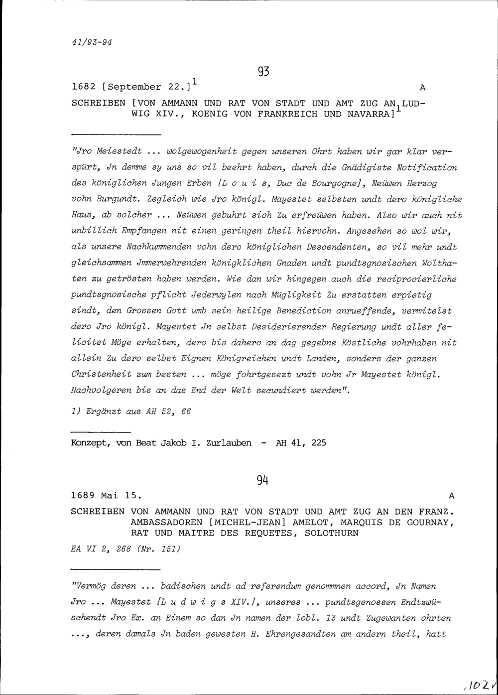 Schreiben des Ammanns und Rats von Stadt und Amt Zug an Michel-Jean Amelot, Marquis...