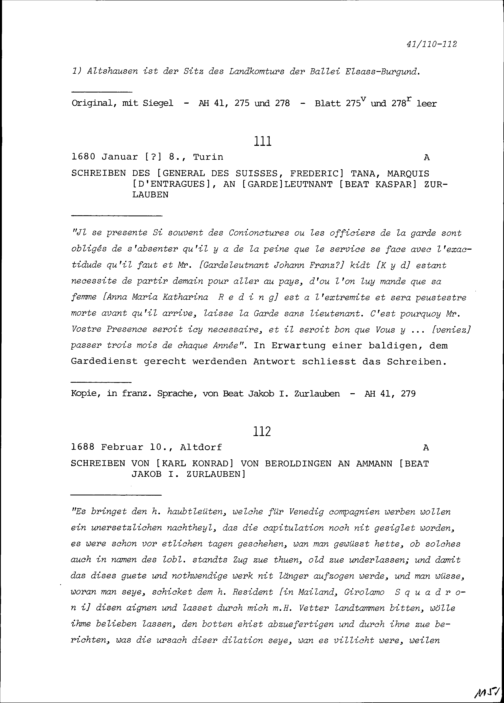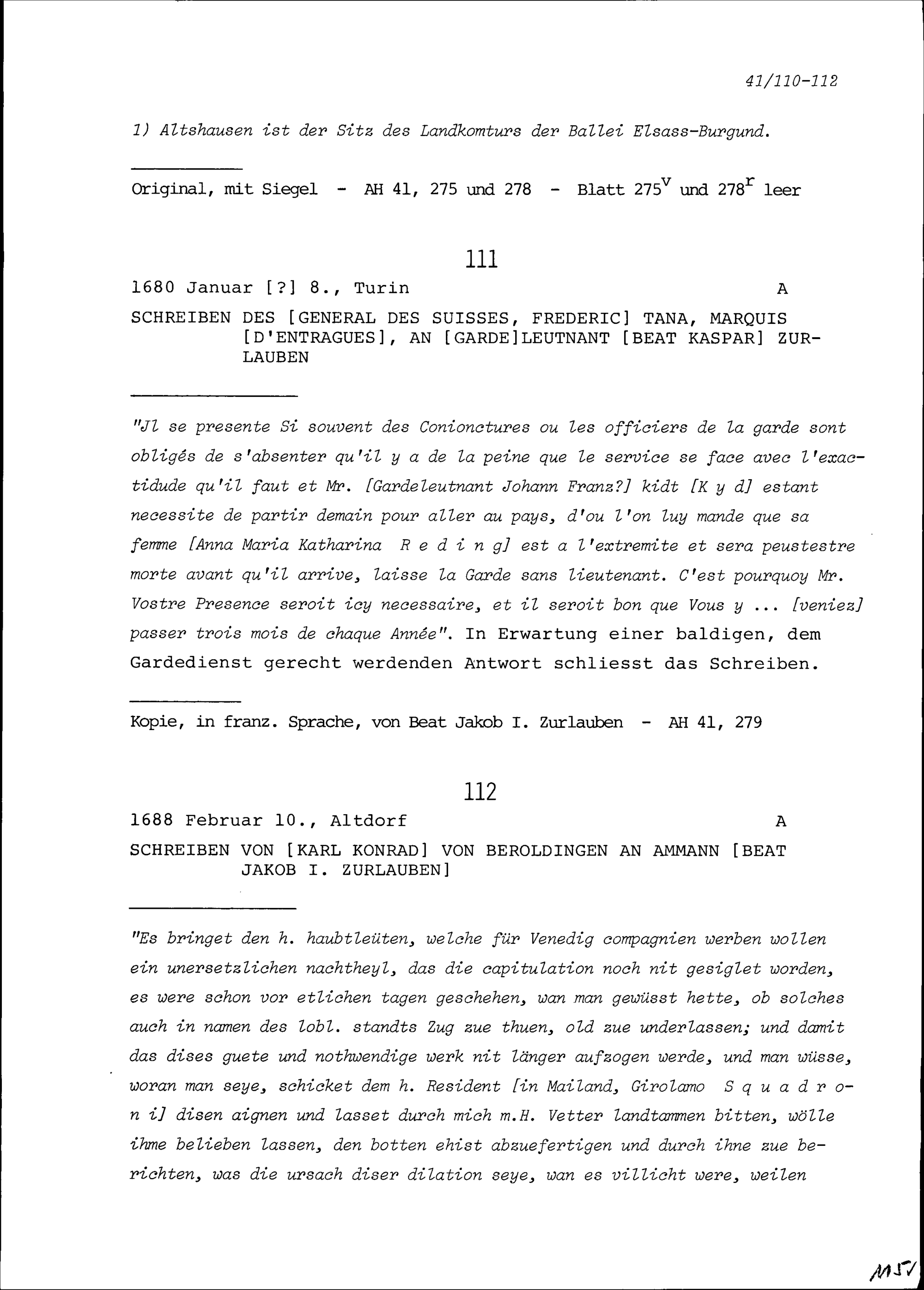 Schreiben von Johann Hartmann von Roggenbach, Landkomtur der Ballei Elsass und Burgund, an Beat Jakob I. Zurlauben, Gerichtsherr zu Hembrunn und Anglikon, Ammann, Landeshauptmann, Zug