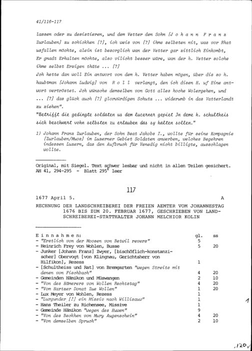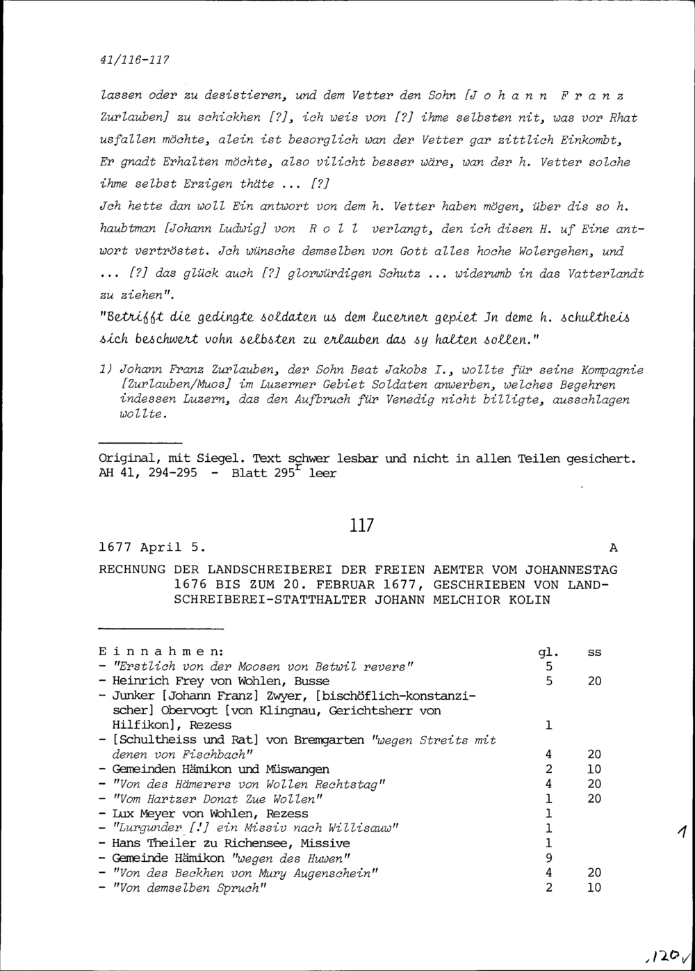 Schreiben von Johann Rudolf Dürler an Beat Jakob I. Zurlauben, Major und Zug