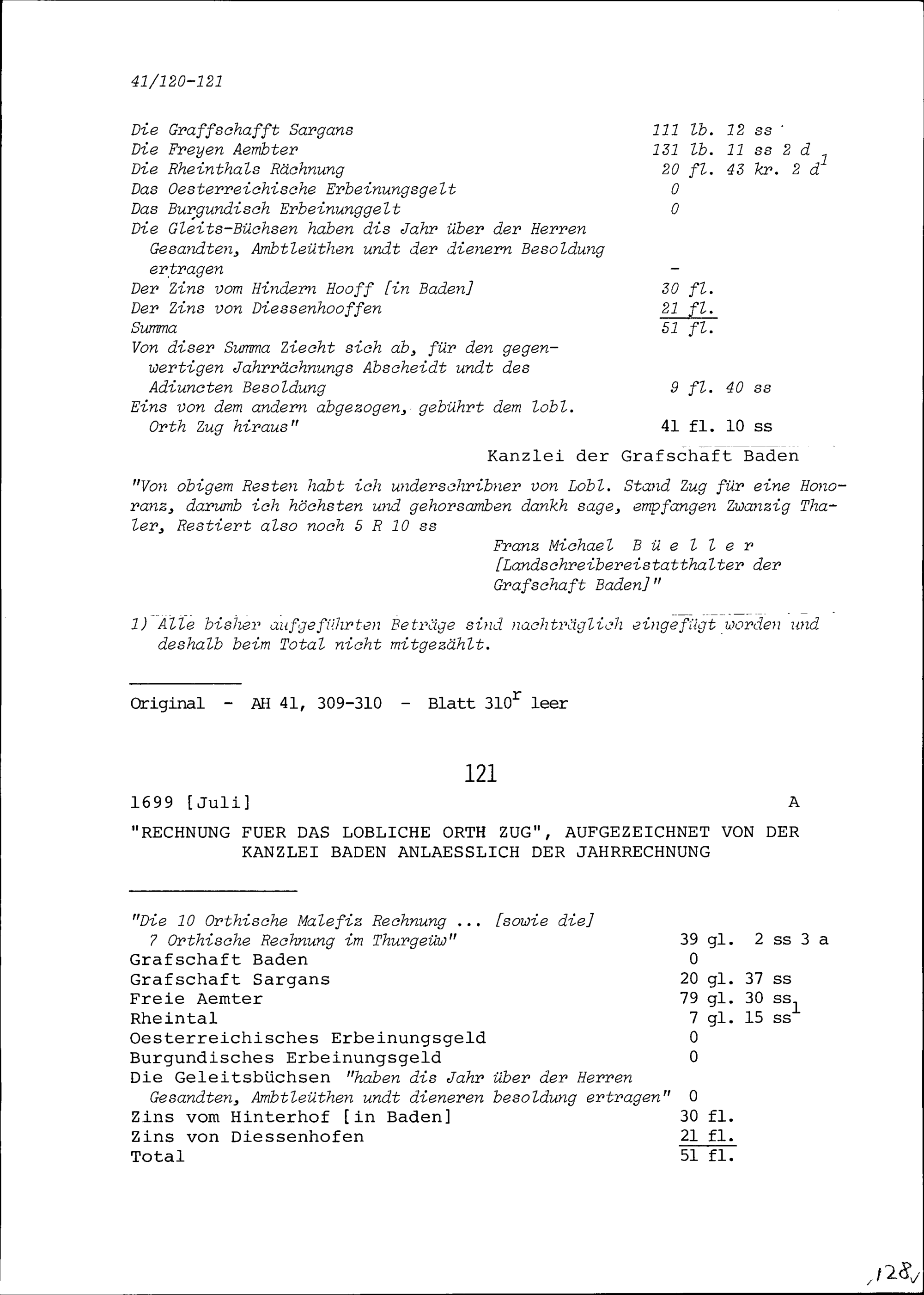 Rechnung für Zug, aufgezeichnet von der Kanzlei in Baden anlässlich der Jahrrechnung