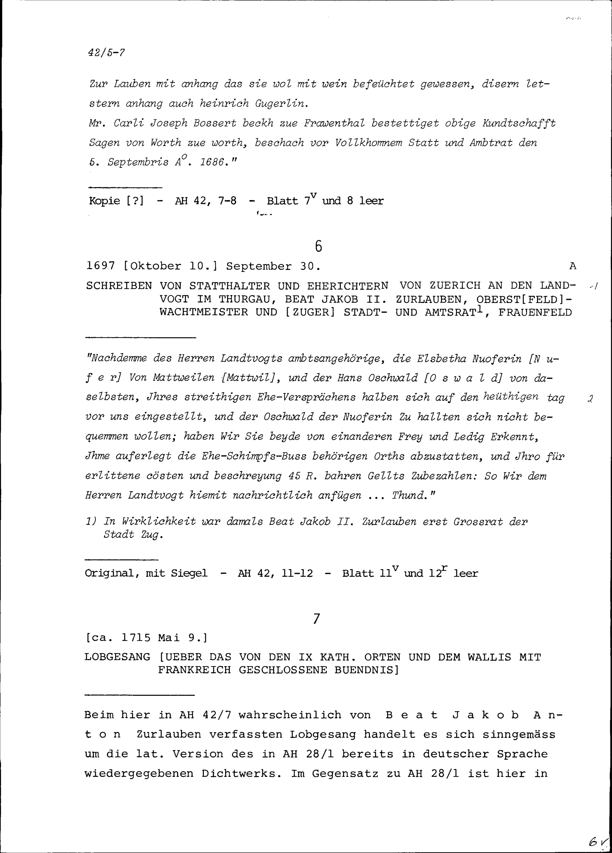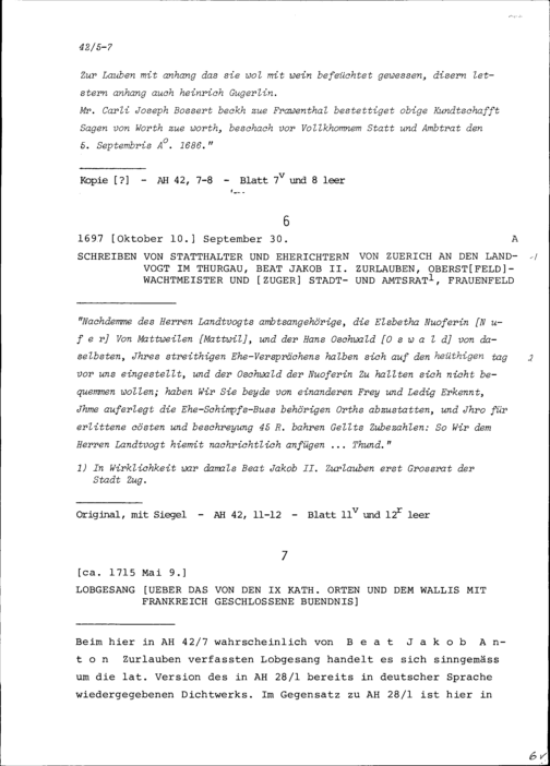 Kundschaftsaussagen vor dem Stadt- und Amtrat Zug, über einen Streit zwischen Karl Josef Bossard und Ludwig Steinbrüchel