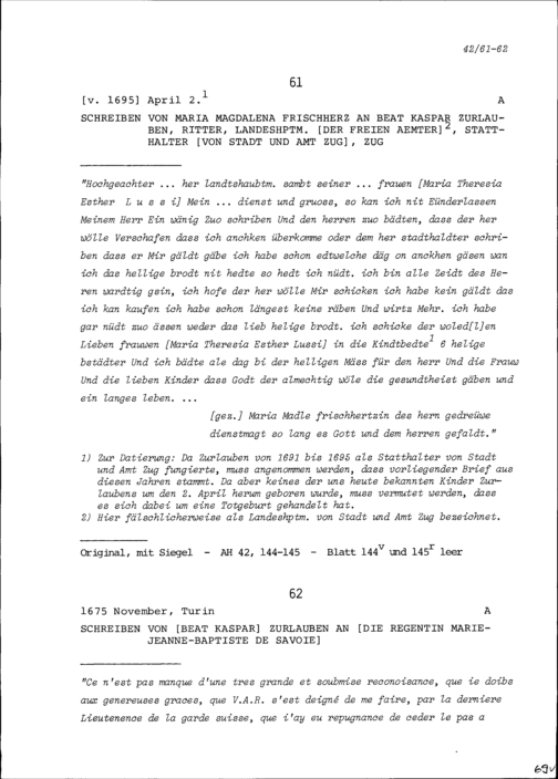 Schreiben von Beat Kaspar Zurlauben an Marie-Jeanne-Baptiste, Regentin und Herzogin von Savoyen