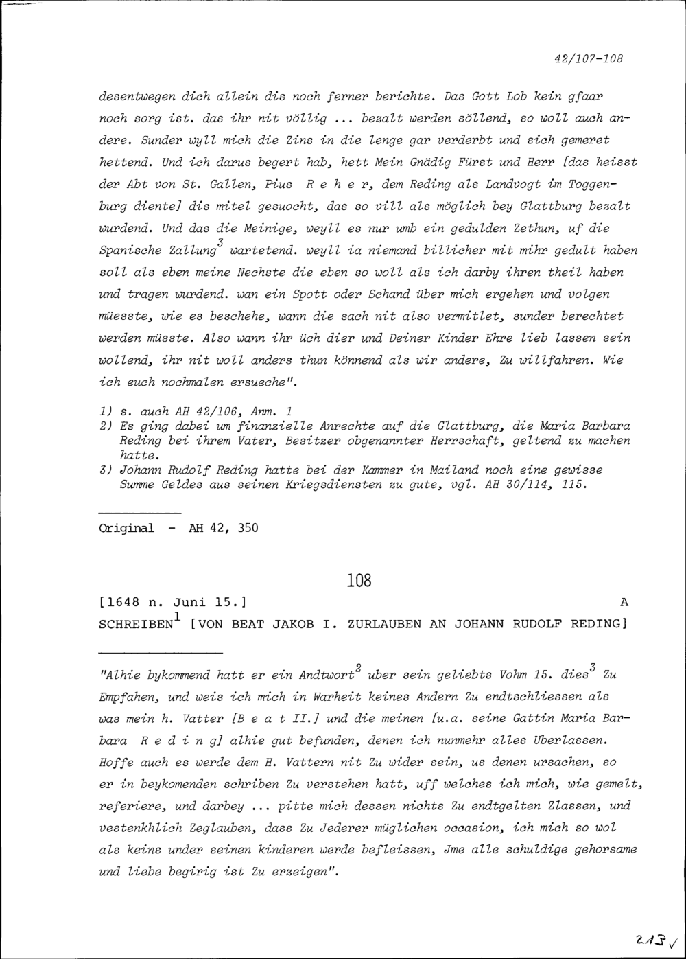 Schreiben von Johann Rudolf Reding an Maria Barbara Zurlauben, geborene Reding, Bremgarten