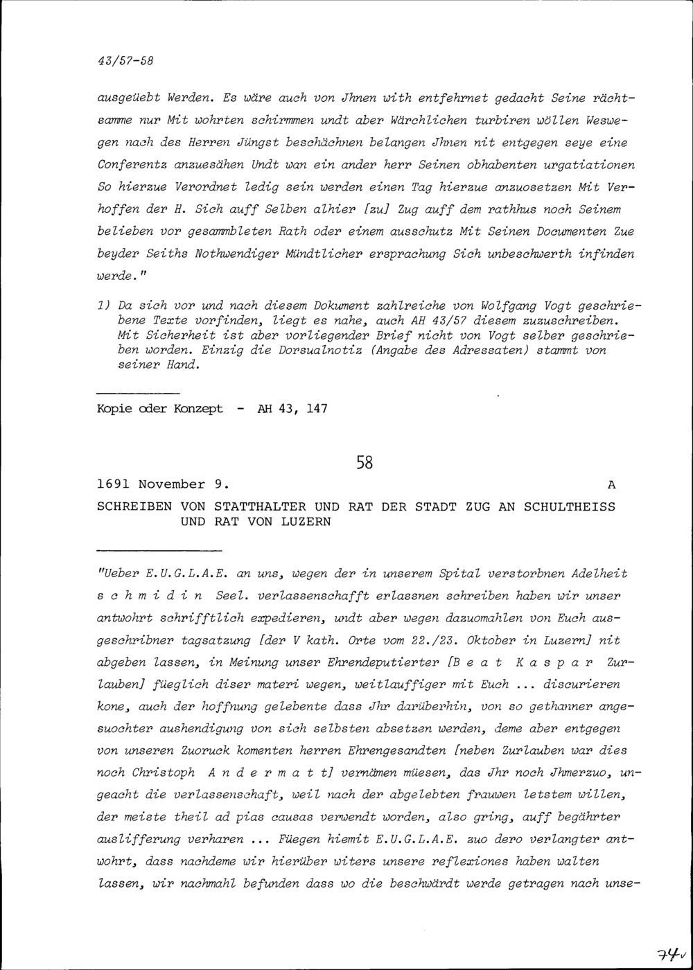 Schreiben von Wolfgang Vogt, Stadtschreiber von Zug, an Johann Martin Schwytzer von...