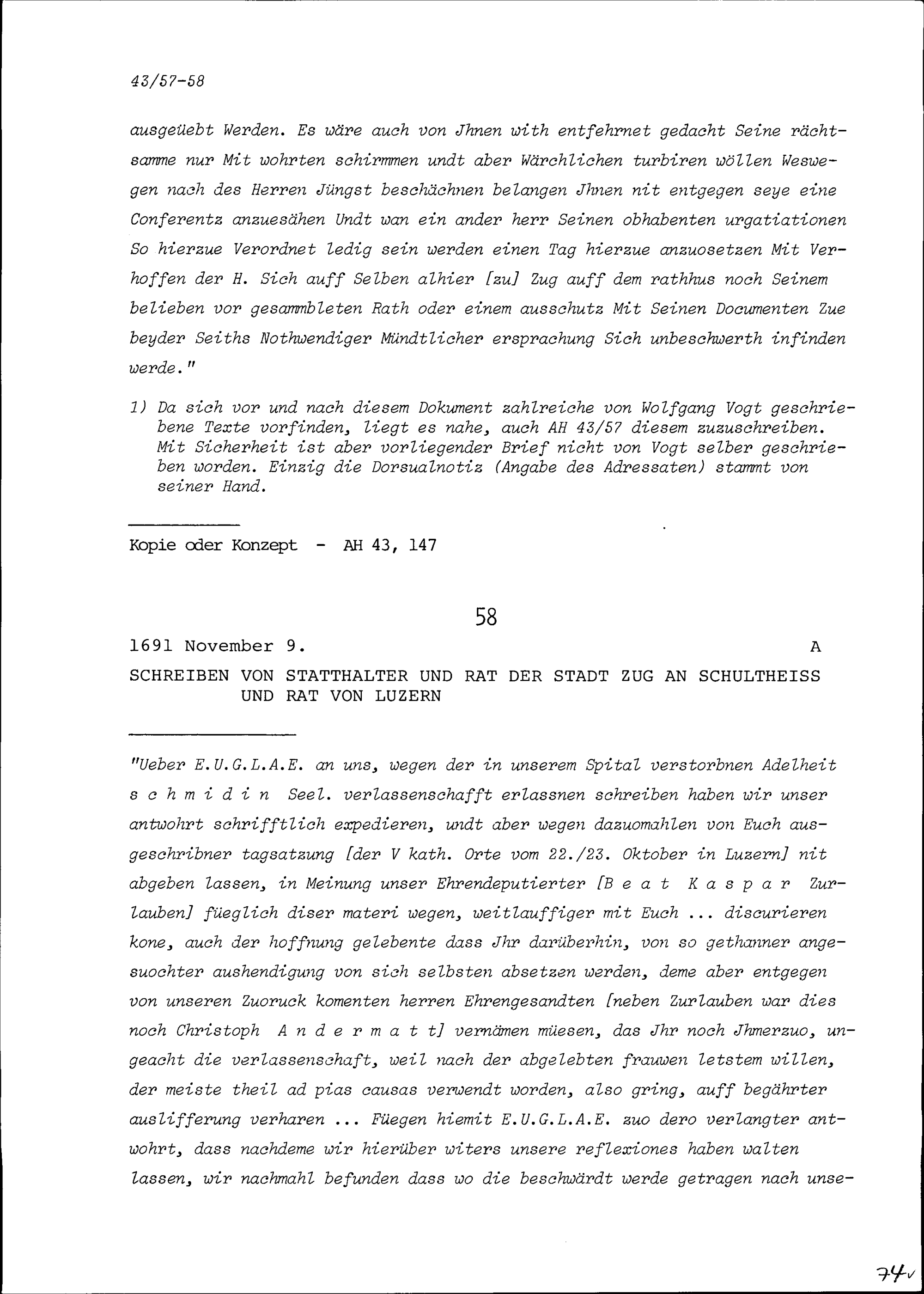 Schreiben von Wolfgang Vogt, Stadtschreiber von Zug, an Johann Martin Schwytzer von Buonas, Gerichtsherr der Herrschaft Buonas und Landvogt der Freien Ämter