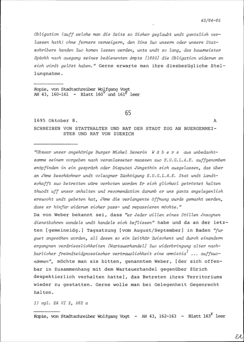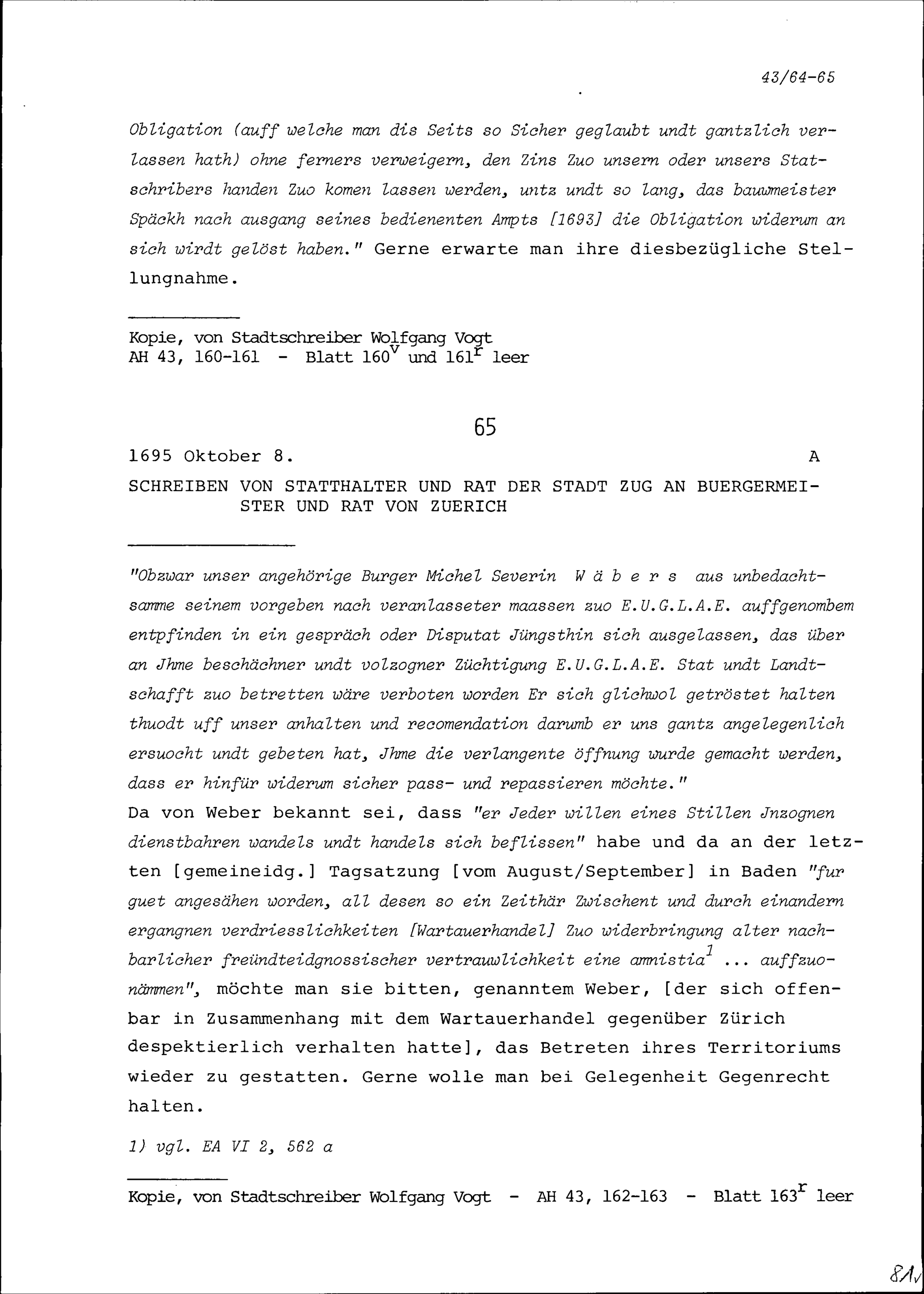 Schreiben des Statthalters und Rats der Stadt Zug an Landammann und Landrat von Obwalden, Sarnen