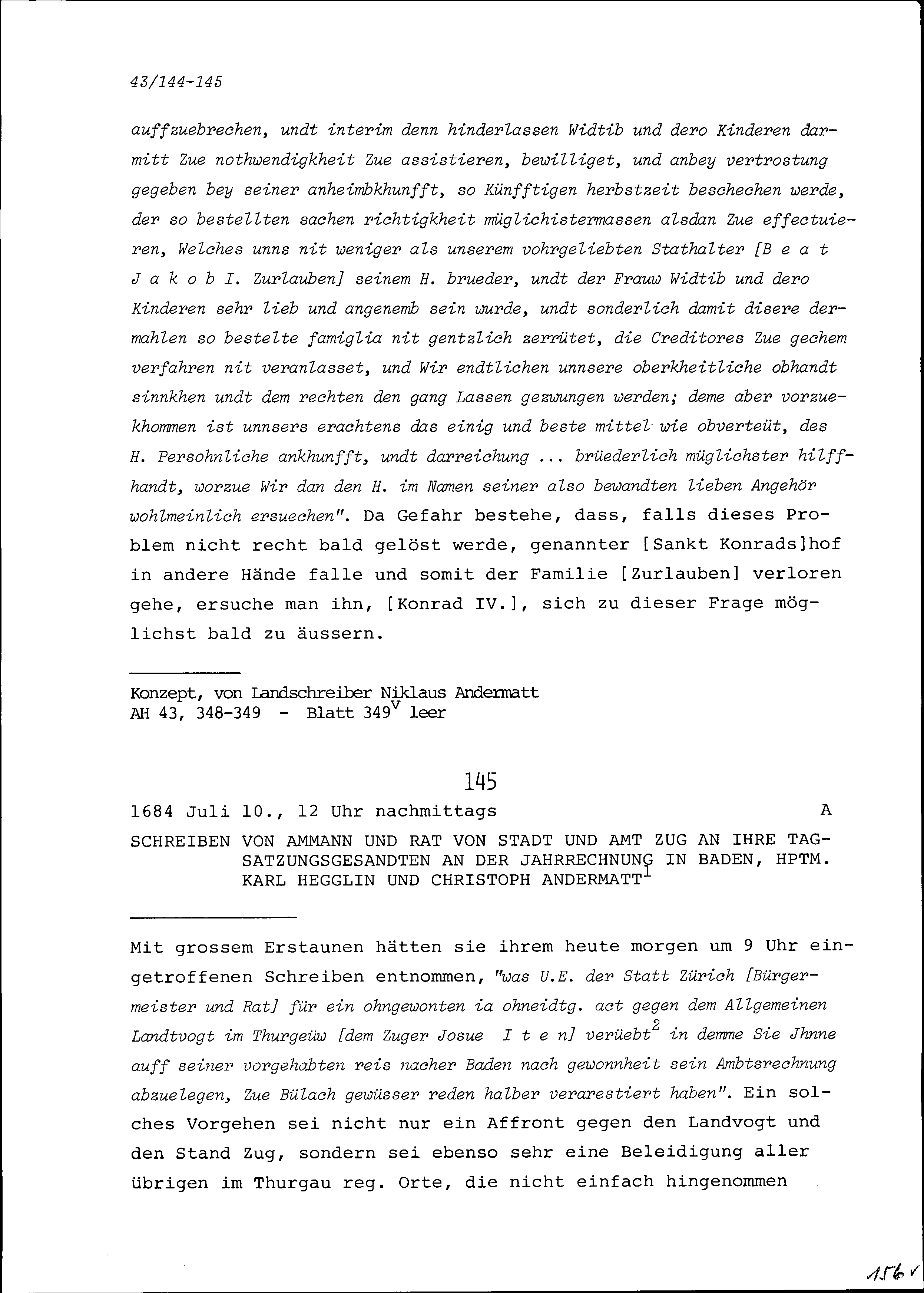 Schreiben des Ammanns und Rats von Stadt und Amt Zug an Konrad IV. Zurlauben