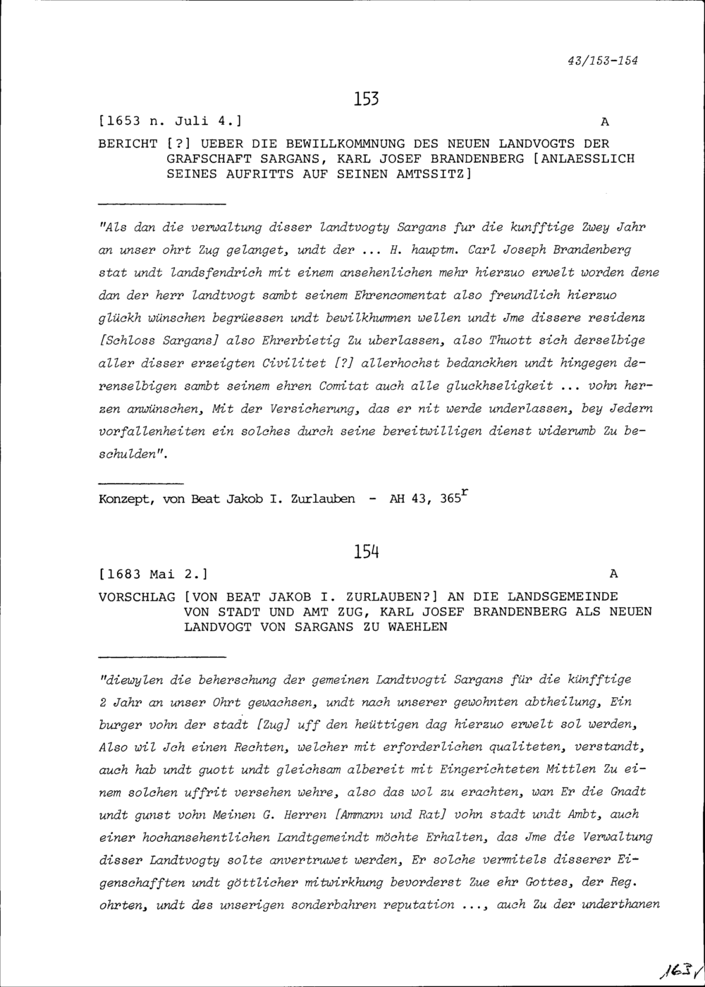Vorschlag von Beat Jakob I. Zurlauben an die Landsgemeinde von Stadt und Amt Zug, Karl Josef Brandenberg als neuen Landvogt von Sargans zu wählen