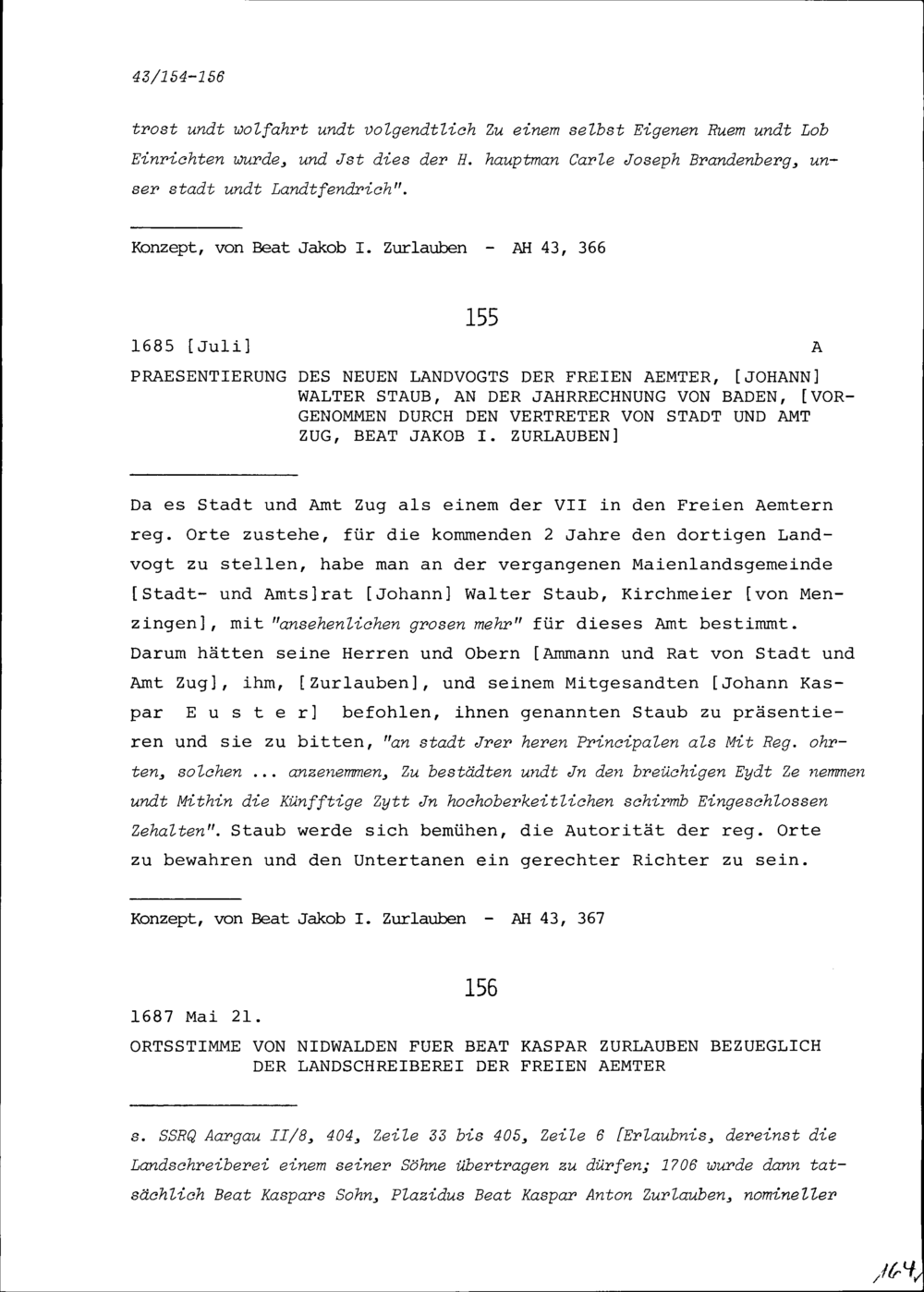 Vorschlag von Beat Jakob I. Zurlauben an die Landsgemeinde von Stadt und Amt Zug, Karl Josef Brandenberg als neuen Landvogt von Sargans zu wählen