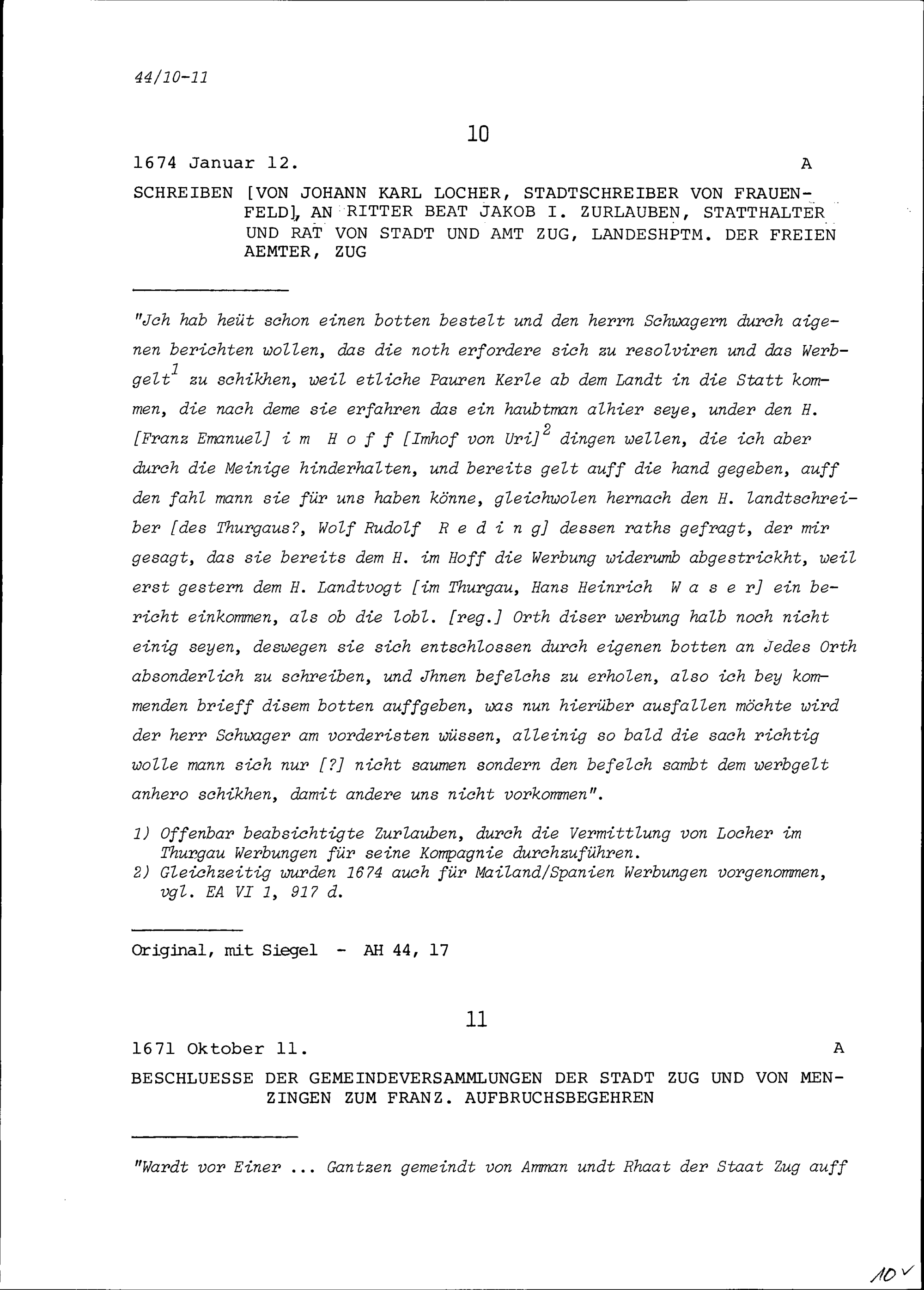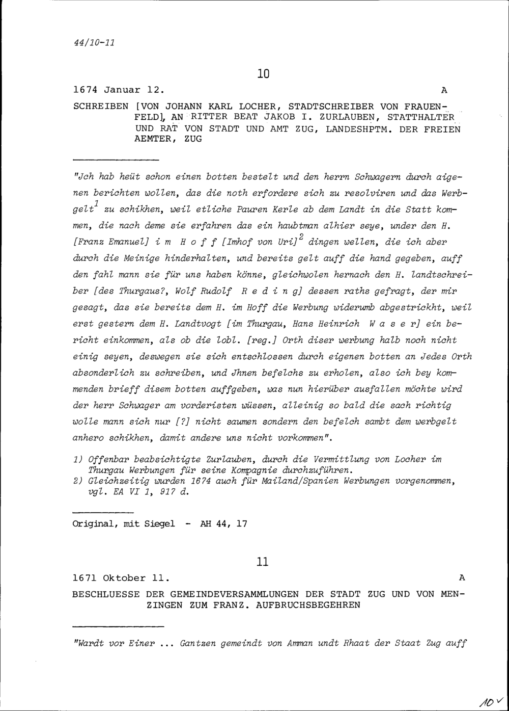 Beschlüsse der Gemeindeversammlungen der Stadt Zug und von Menzingen zum französischen Aufbruchsbegehren
