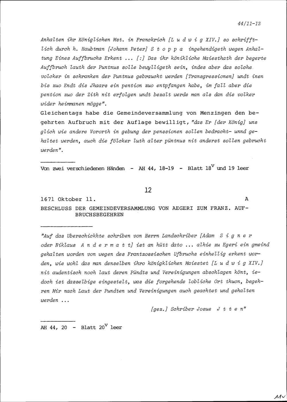 Beschlüsse der Gemeindeversammlungen der Stadt Zug und von Menzingen zum französischen Aufbruchsbegehren