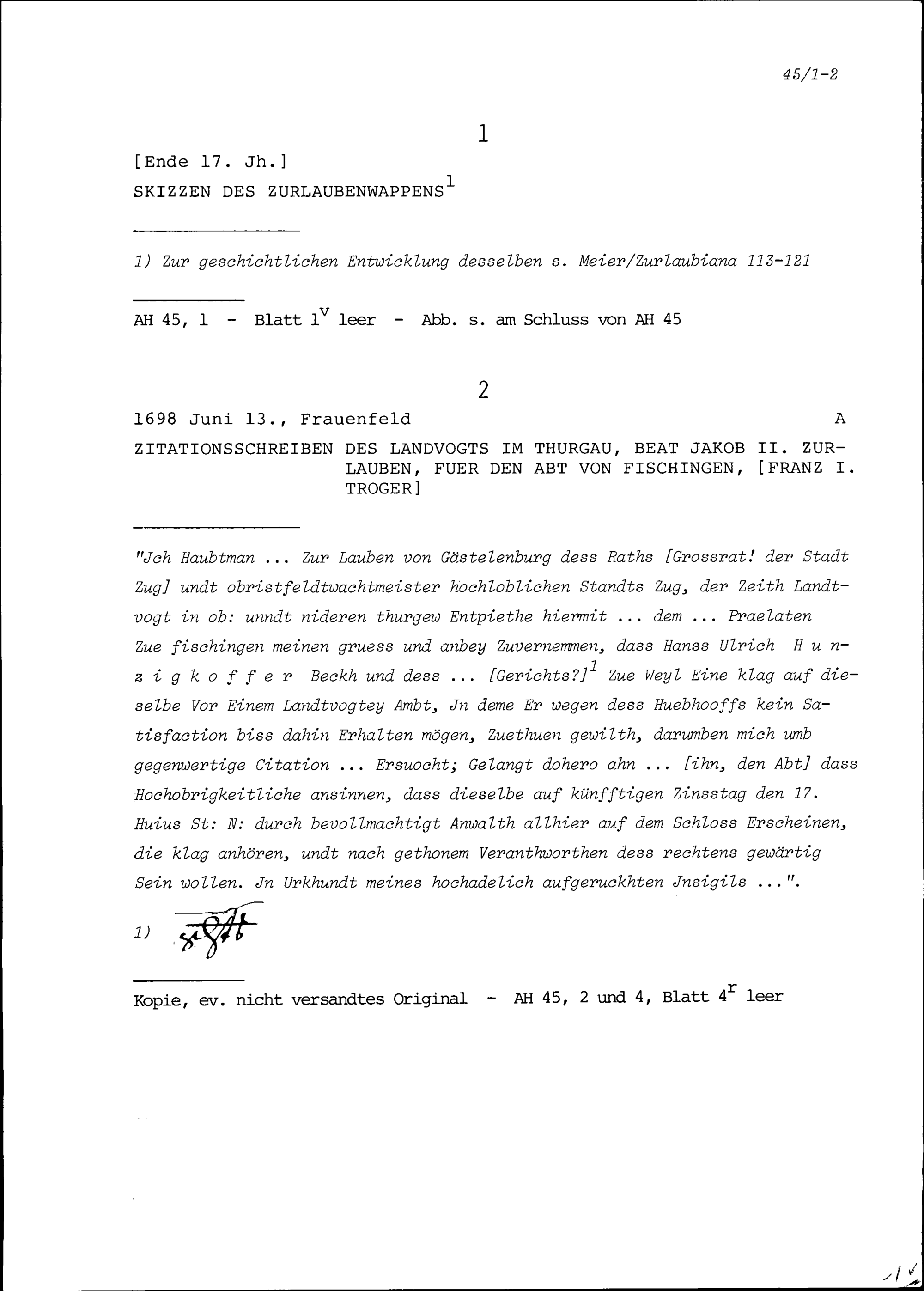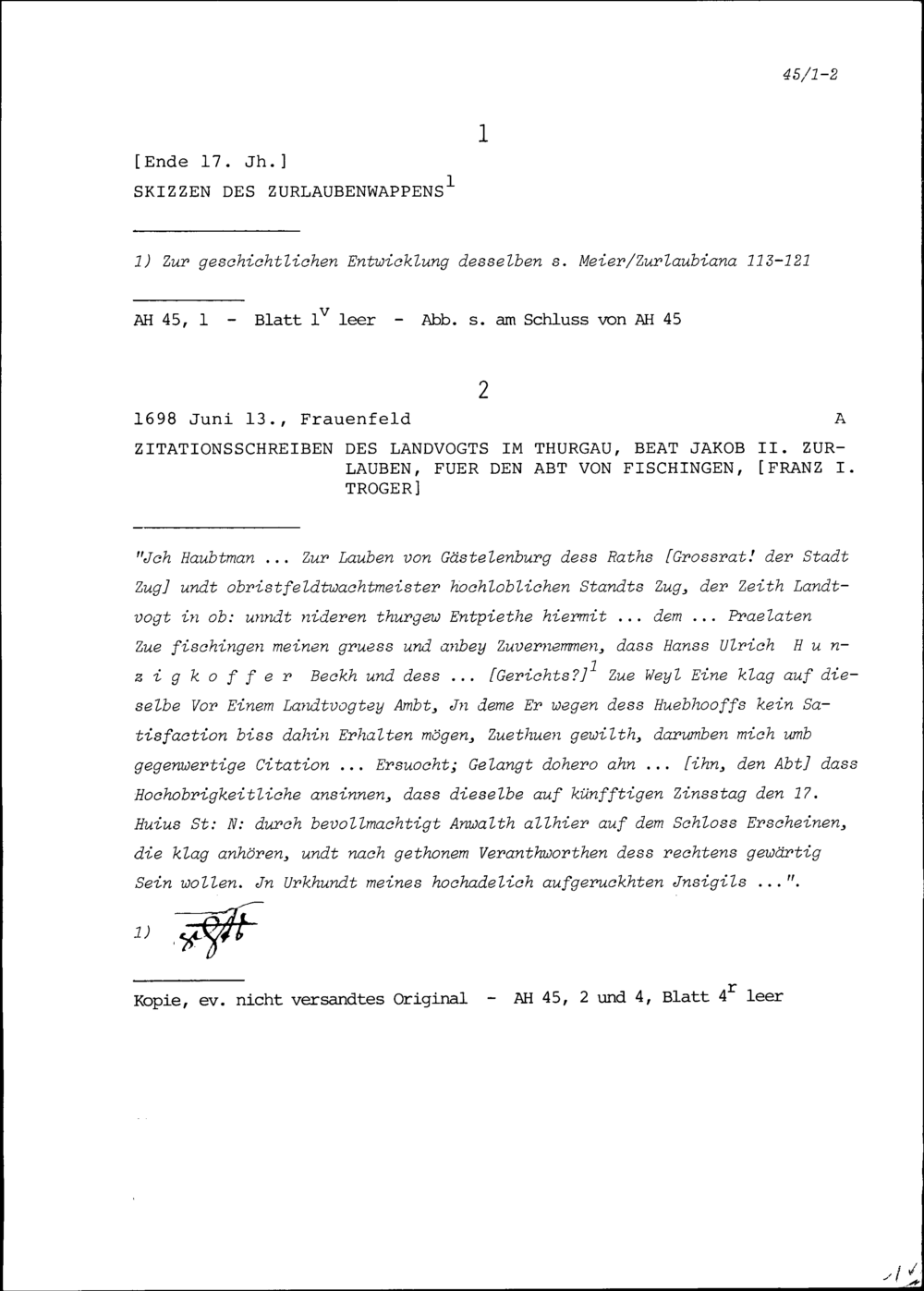 Zitationsschreiben von Beat Jakob II. Zurlauben, Landvogt im Thurgau, für Franz I. Troger, Abt von Fischingen