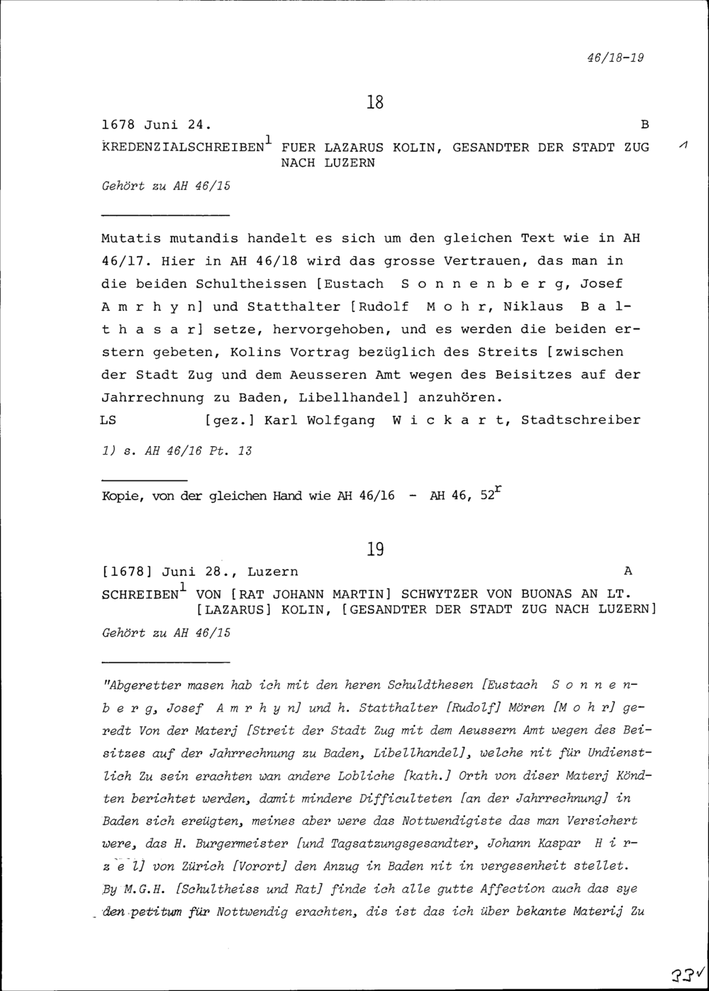 Schreiben von Johann Martin Schwytzer von Buonas, Rat, an Lazarus Kolin, Leutnant und Gesandter der Stadt Zug nach Luzern