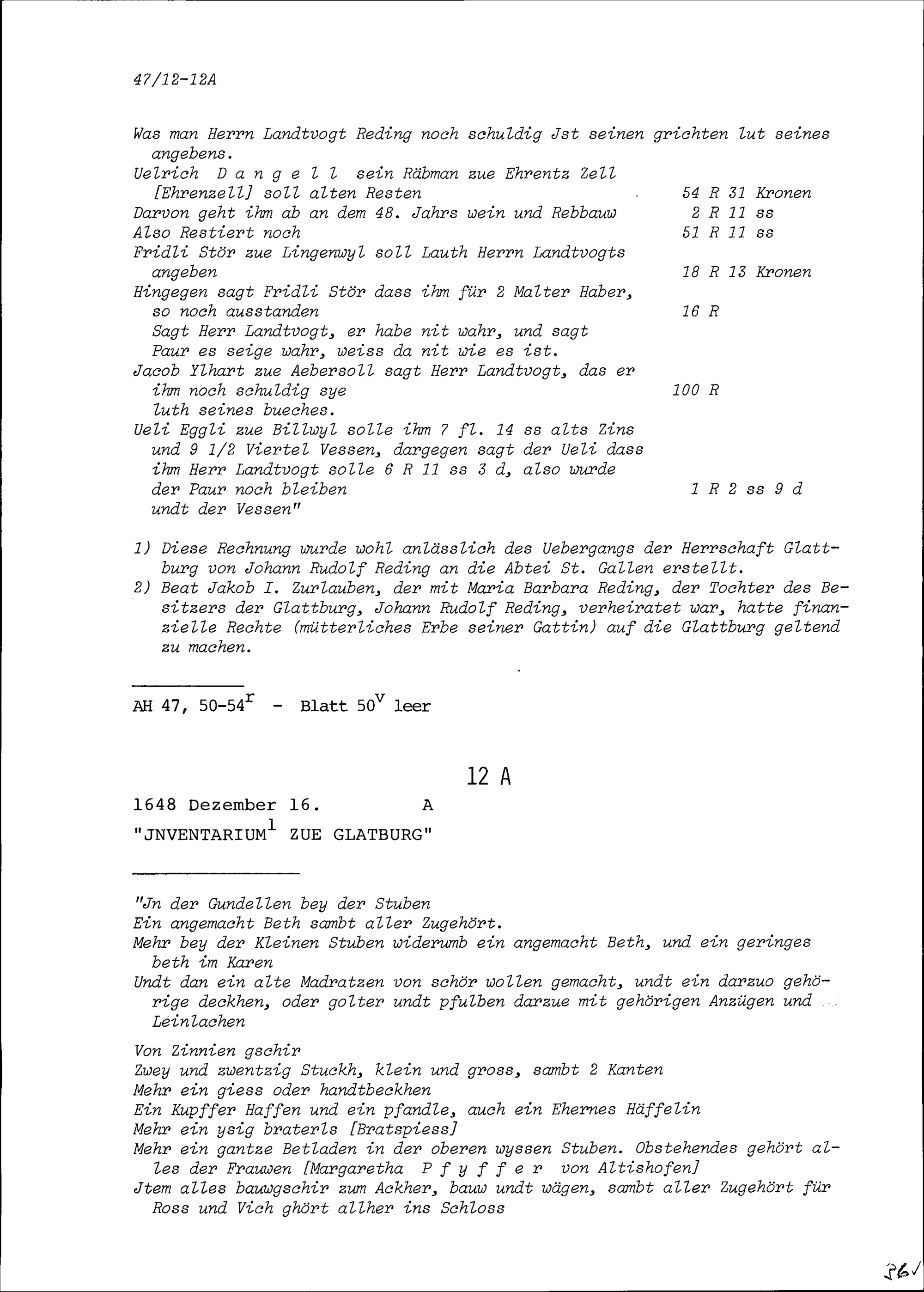 Rechnung von Jörg Gresser mit den Bauern der Herrschaft Glattburg, die von Johann Rudolf Reding, Landvogt im Toggenburg, Herr der Glattburg, am 16. Dezember gutgeheissen wurde