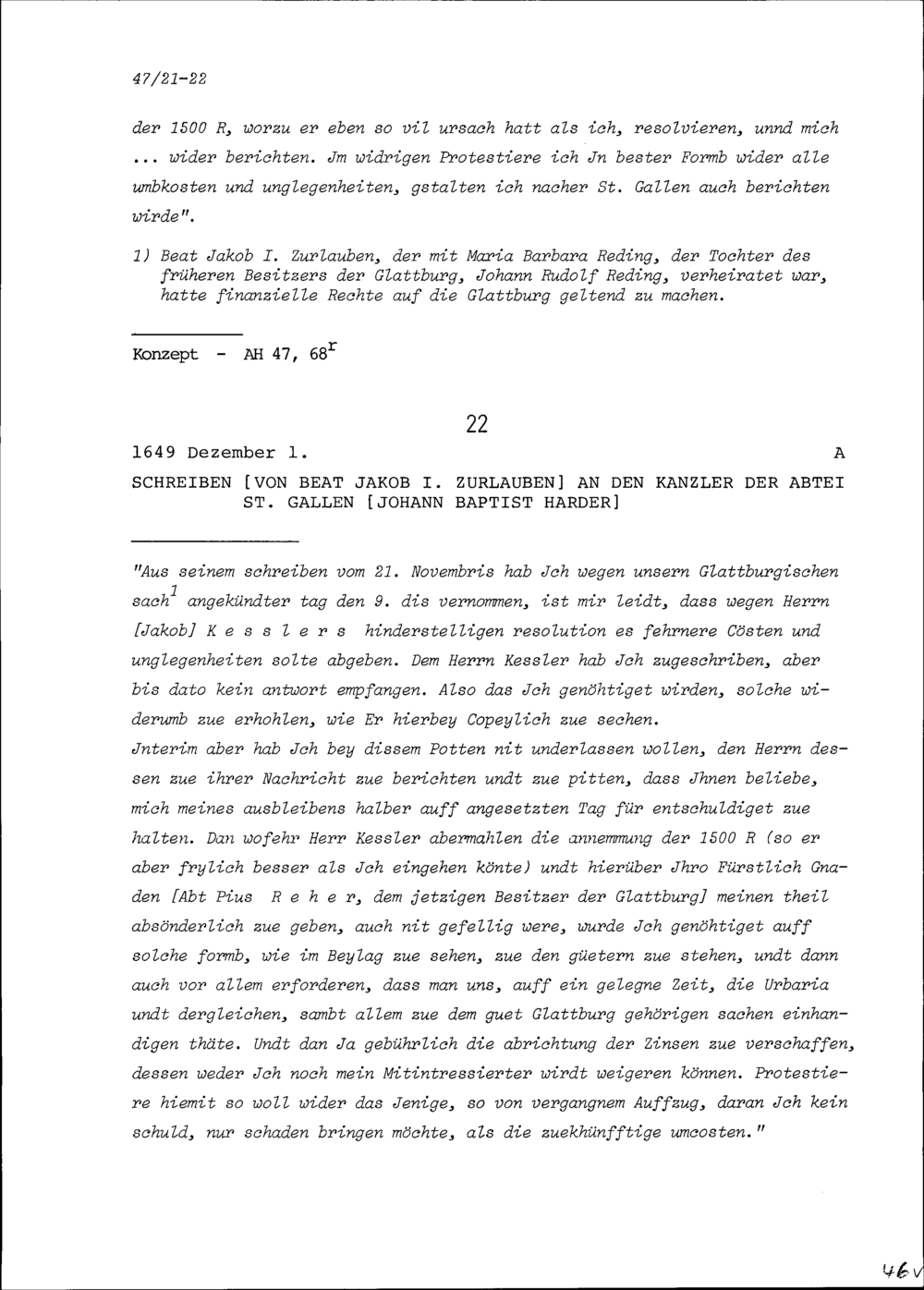 Schreiben von Beat Jakob I. Zurlauben an Jakob Kessler, Landvogt von Uznach