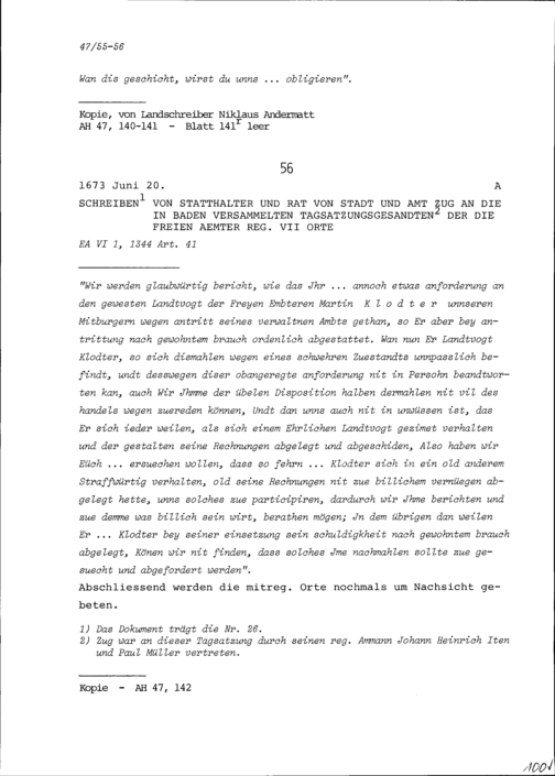 Schreiben des Ammanns und Rats von Stadt und Amt Zug an Johann Georg Bachmann, Landvogt...