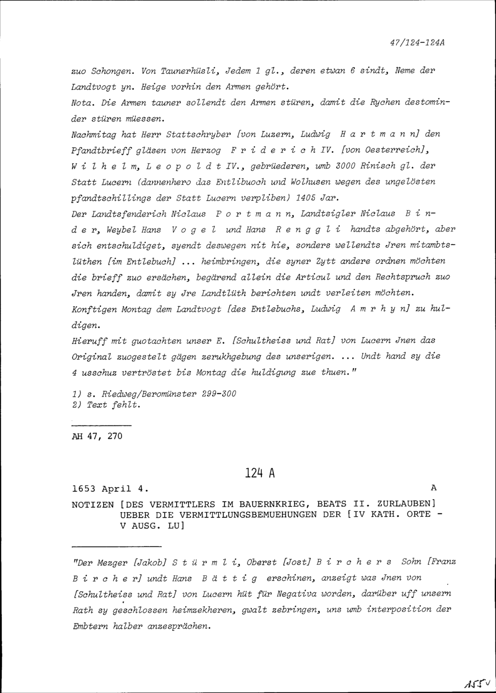 Notiz von Beat II. Zurlauben, Vermittler im Bauernkrieg, über die Vermittlungsbemühungen der Vier Katholischen Orte