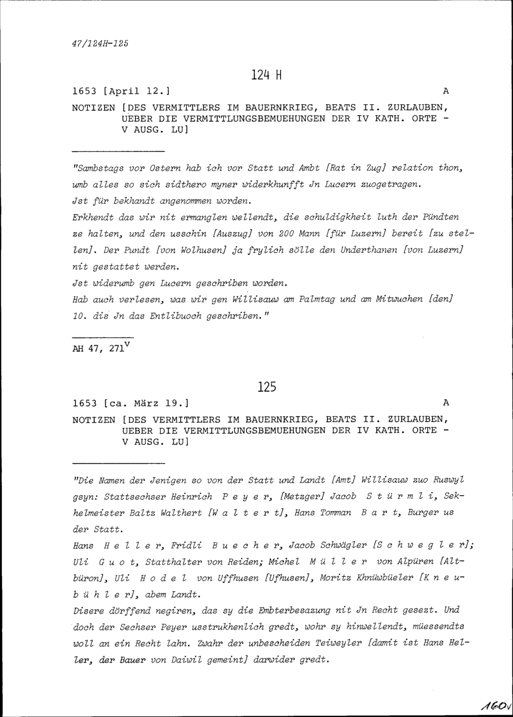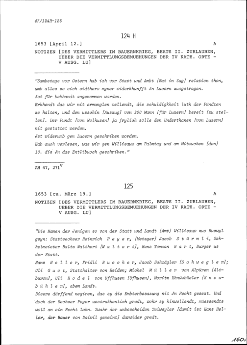 Notiz von Beat II. Zurlauben, Vermittler im Bauernkrieg, über die Vermittlungsbemühungen der Vier Katholischen Orte