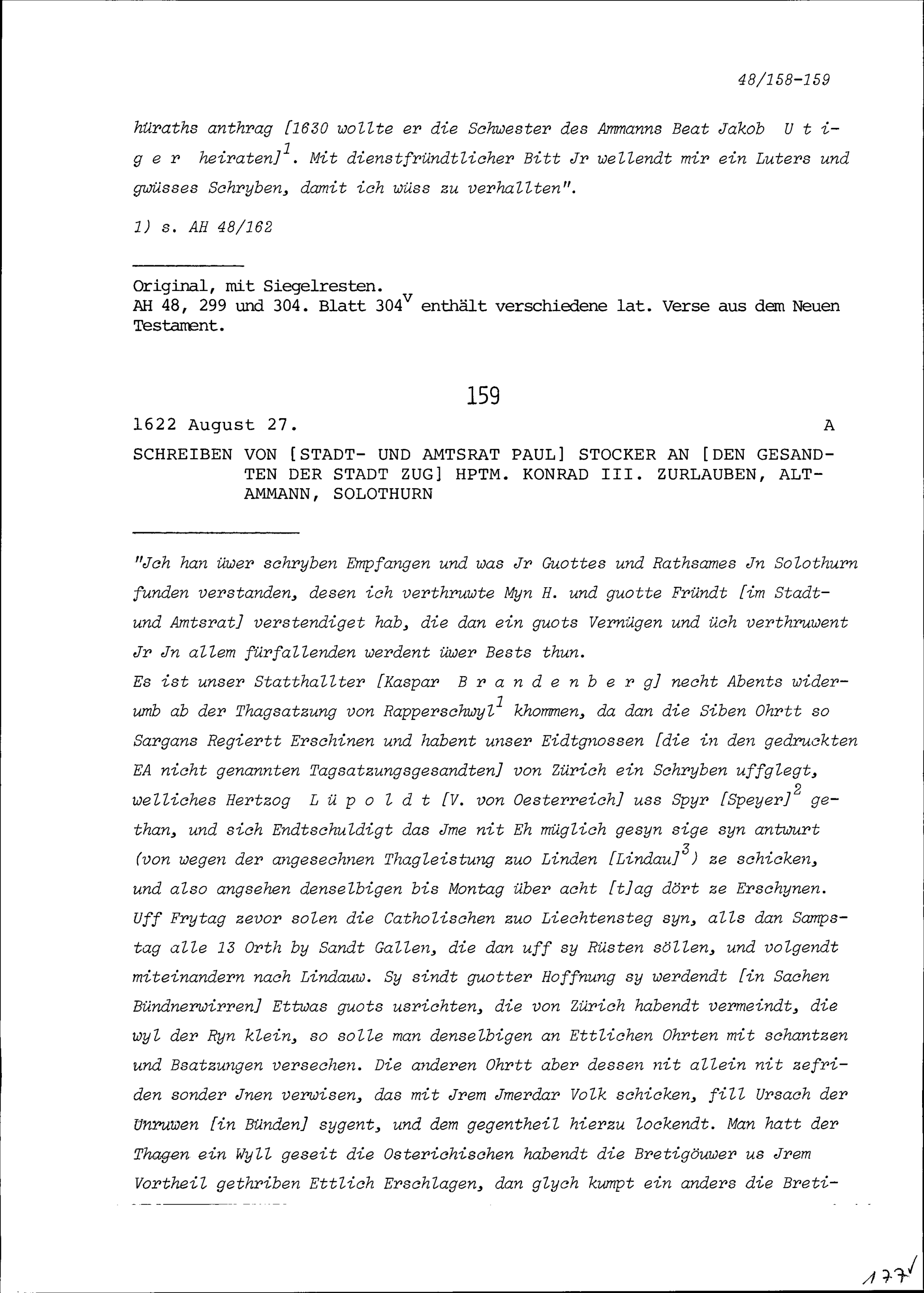 Schreiben von Oswald II. Zurlauben an Beat II. Zurlauben, Landschreiber, Zug