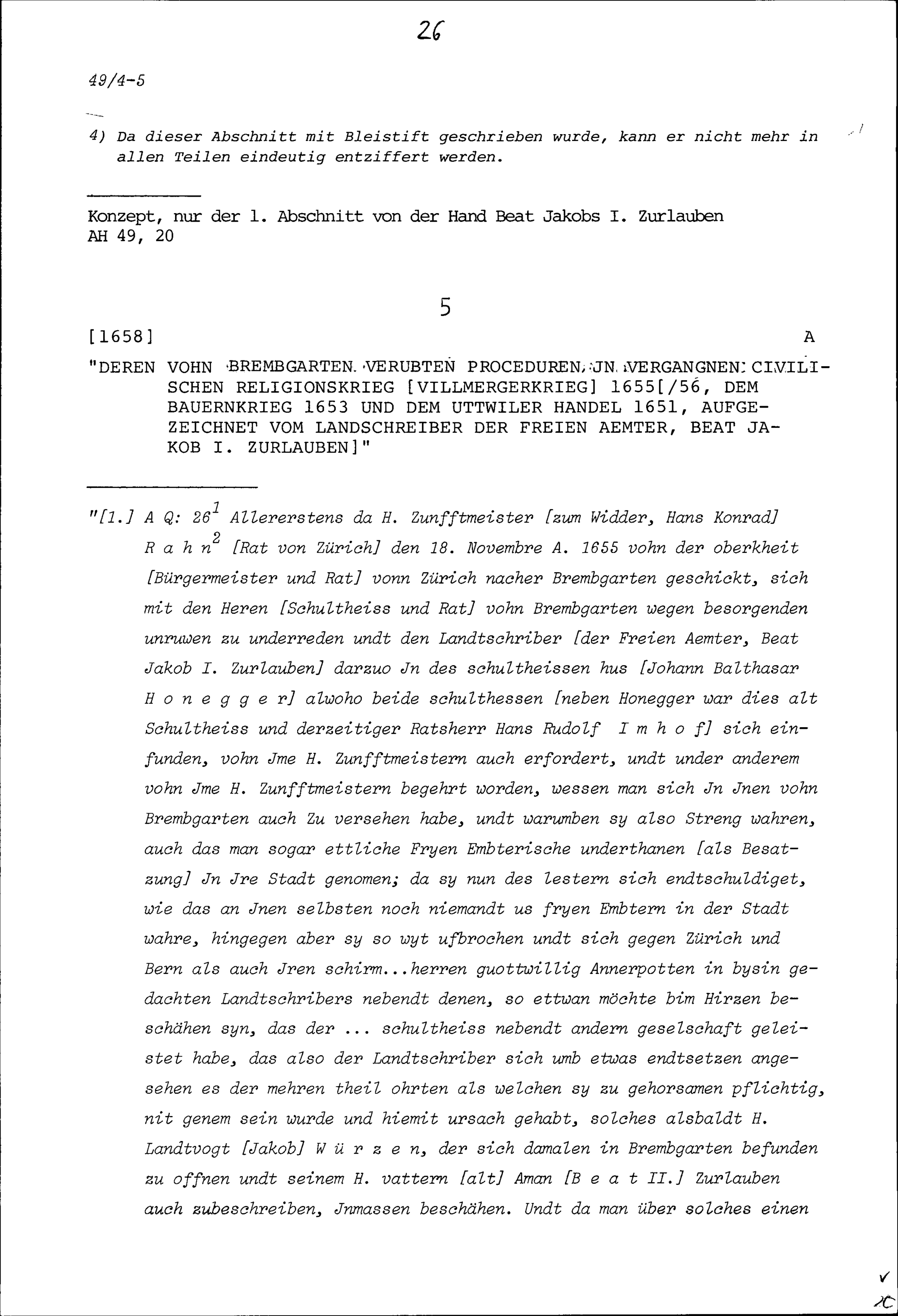 Vortrag von Beat Jakob I. Zurlauben, Landschreiber der Freien Ämter, vor der Tagsatzung der Fünf Katholischen Orte in Luzern vom 8. und 9. März 1657