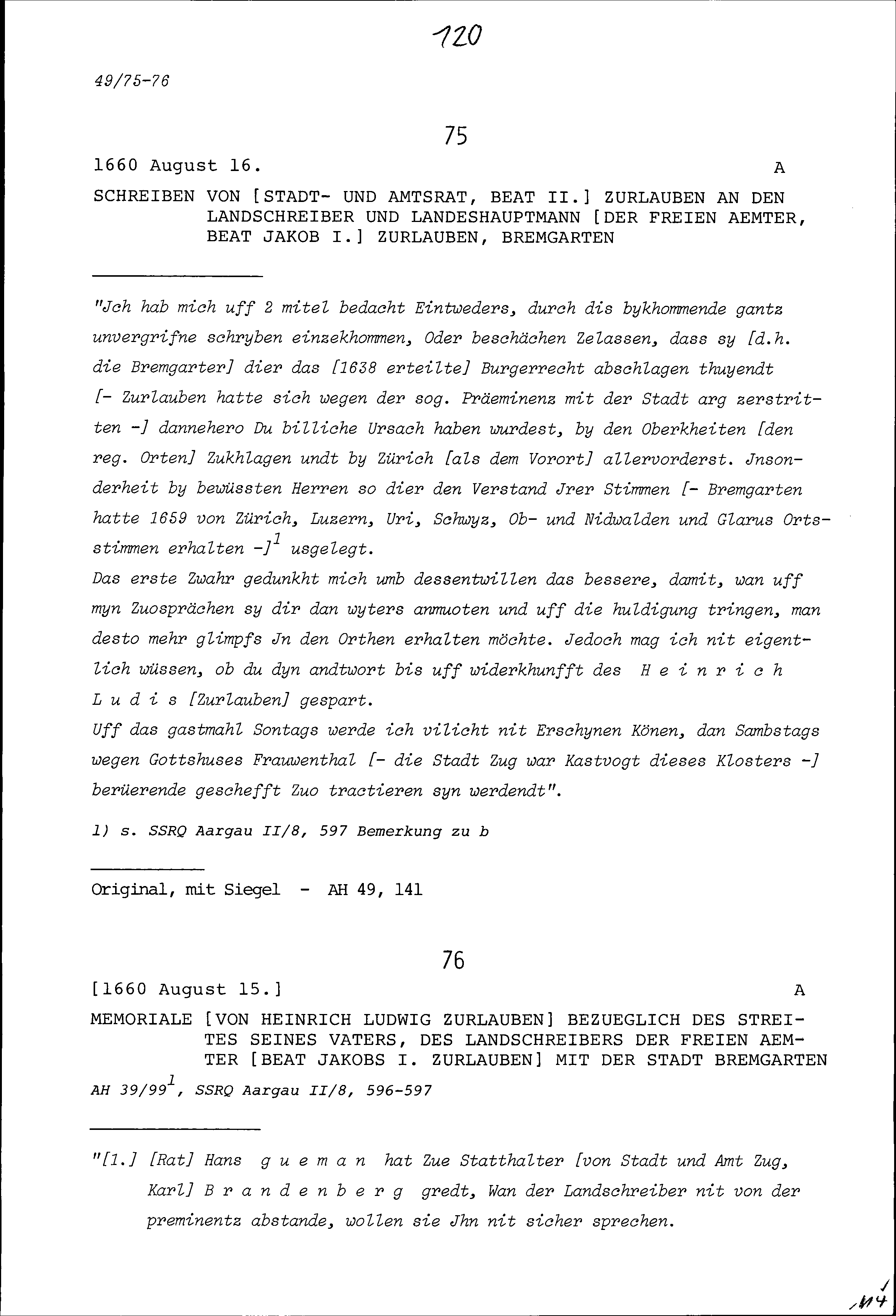 Bericht von Heinrich Ludwig Zurlauben bezüglich des Streits seines Vaters und von Beat Jakob I. Zurlauben, Landschreiber der Freien Ämter, mit der Stadt Bremgarten
