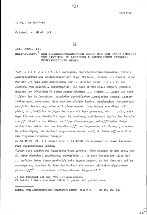 Bericht von Simon Marx, Landschreibersubstituten der Freien Ämter, bezüglich der...