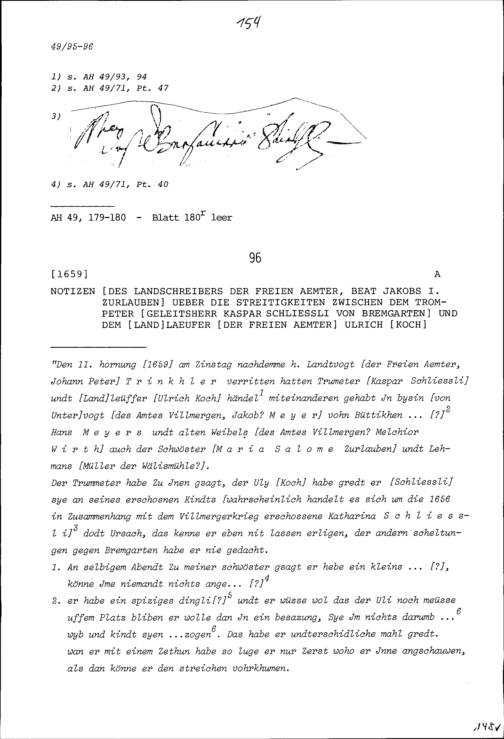 Notiz von Beat Jakob I. Zurlauben, Landschreiber der Freien Ämter, über seine Streitigkeiten mit der Stadt Bremgarten