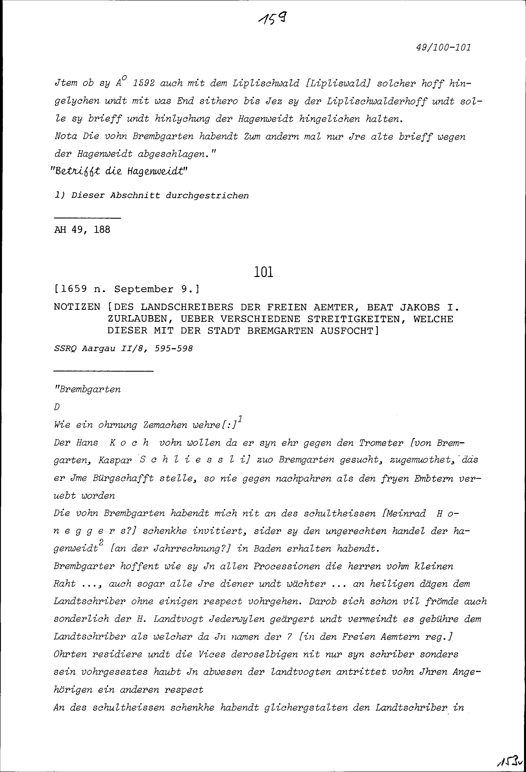 Notiz von Beat Jakob I. Zurlauben, Landschreiber der Freien Ämter, in Zusammenhang mit verschiedenen Streitigkeiten, welche dieser mit der Stadt Bremgarten hatte