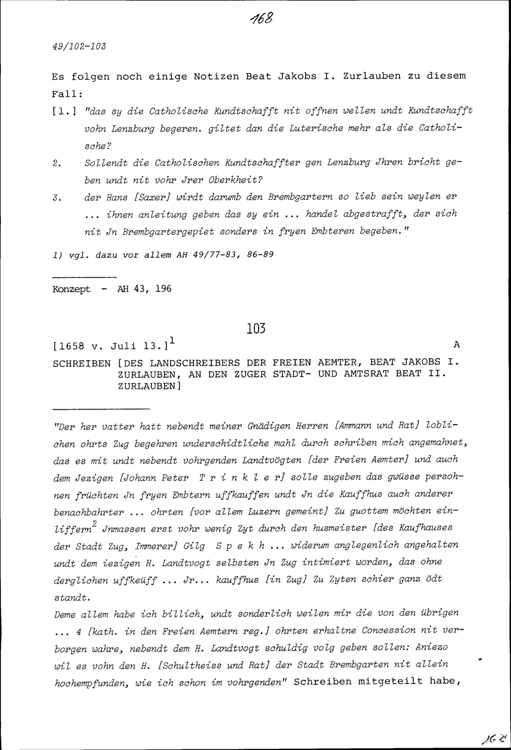 Schreiben von Beat Jakob I. Zurlauben, Landschreiber der Freien Ämter, an Meinrad...