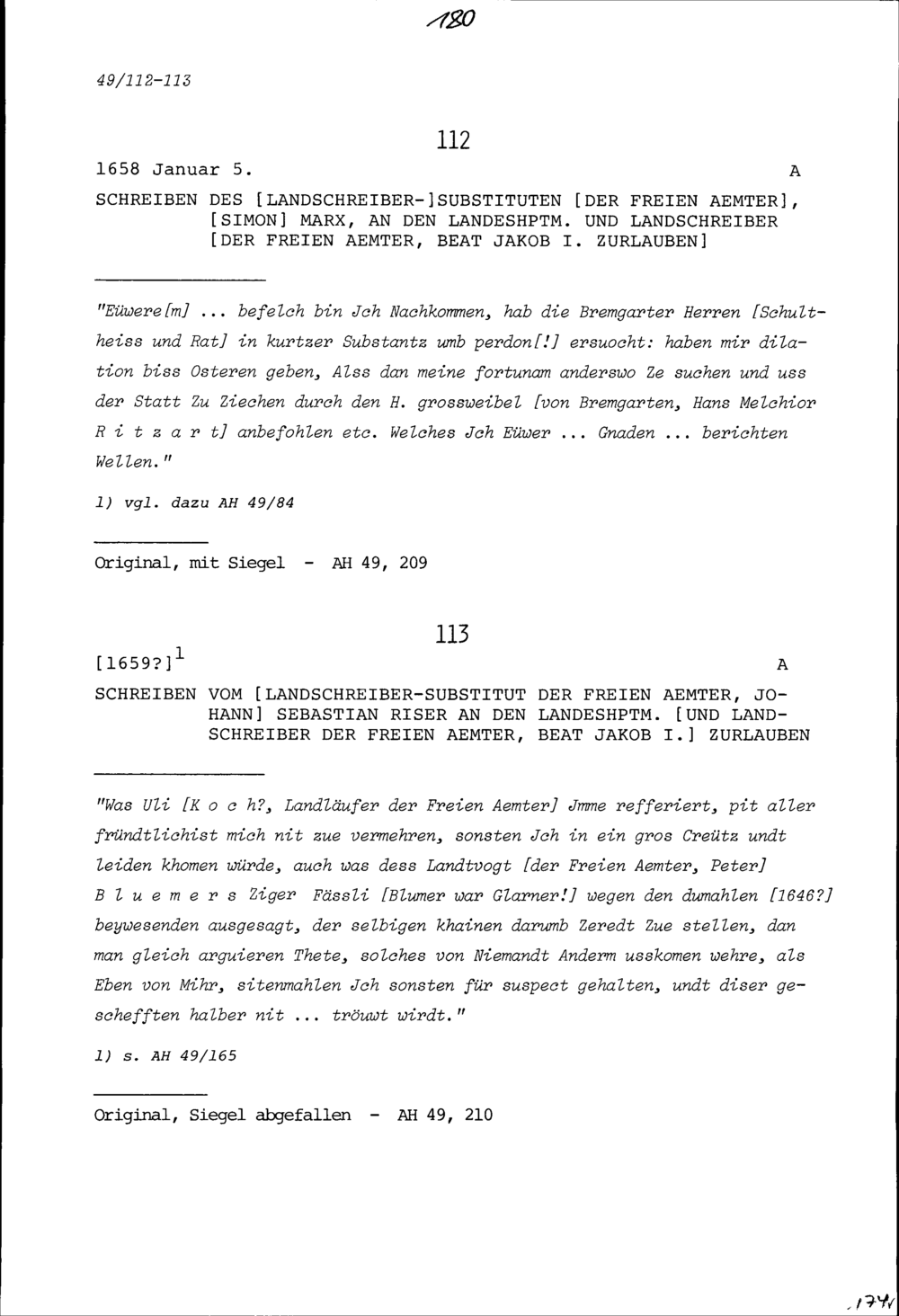 Schreiben von Johann Sebastian Riser, Landschreibersubstitut der Freien Ämter an Beat Jakob I. Zurlauben, Landeshauptmann und Landschreiber der Freien Ämter