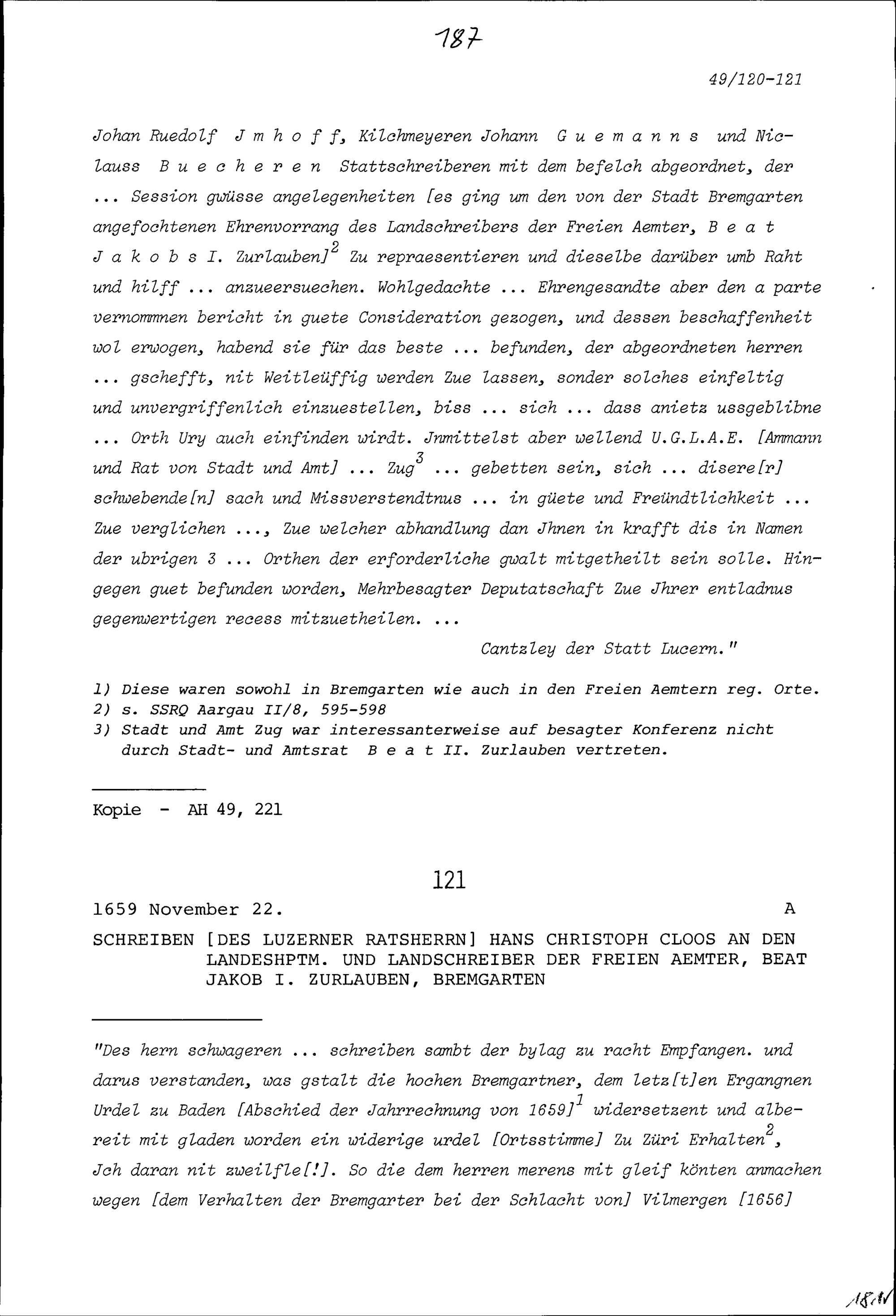 Rezess an der Tagsatzung der Vier Katholischen Orte in Luzern zuhanden einer dahin abgeordneten Gesandtschaft der Stadt Bremgarten