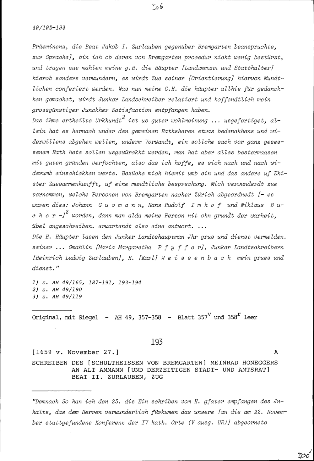 Schreiben von Kaspar Elmer, Landvogt der Freien Ämter an Beat Jakob I. Zurlauben, Landeshauptmann und Landschreiber der Freien Ämter, Bremgarten