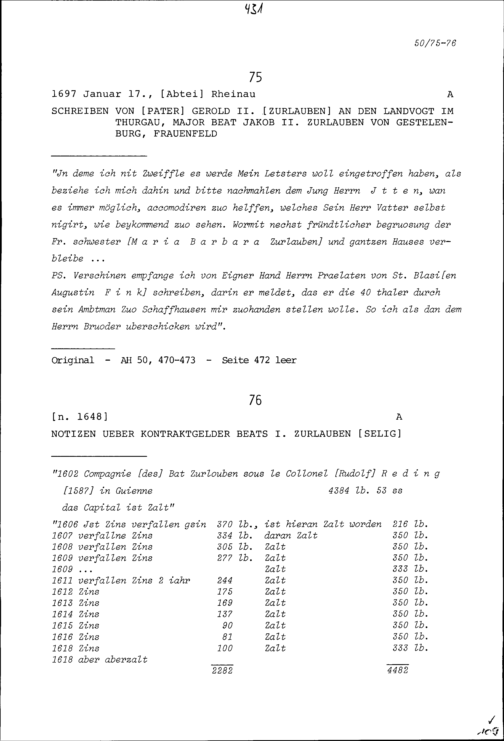 Notiz über Kontraktgelder von Beat I. Zurlauben, selig